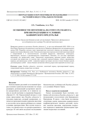 УЗЯНБАЕВА Л.Х., РЕУТ А. А. ОСОБЕННОСТИ ОНТОГЕНЕЗА DIANTHUSPLUMARIUS L. ПРИ ИНТРОДУКЦИИ В УСЛОВИЯХ БАШКИРСКОГО ПРЕДУРАЛЬЯ // ПРОМЫШЛЕННАЯ БОТАНИКА. 2025. № 2, ТОМ 25