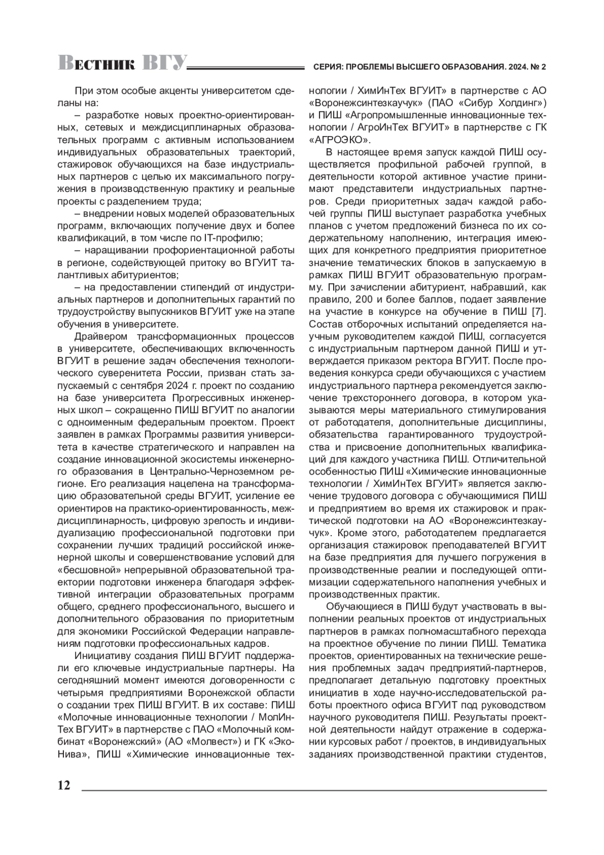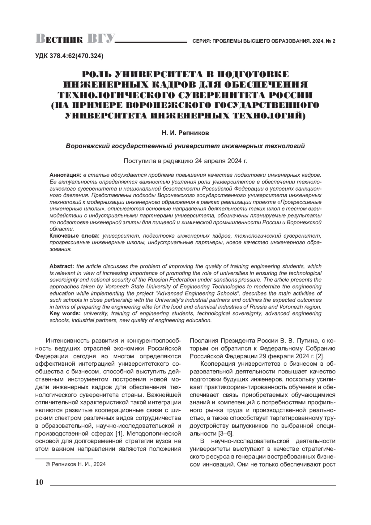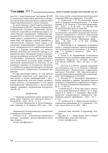 РЕПНИКОВ Н. И. РОЛЬ УНИВЕРСИТЕТА В ПОДГОТОВКЕ ИНЖЕНЕРНЫХ КАДРОВ ДЛЯ ОБЕСПЕЧЕНИЯ ТЕХНОЛОГИЧЕСКОГО СУВЕРЕНИТЕТА РОССИИ (НА ПРИМЕРЕ ВОРОНЕЖСКОГО ГОСУДАРСТВЕННОГО УНИВЕРСИТЕТА ИНЖЕНЕРНЫХ ТЕХНОЛОГИЙ) // ВЕСТНИК ВОРОНЕЖСКОГО ГОСУДАРСТВЕННОГО УНИВЕРСИТЕТА. СЕРИЯ: ПРОБЛЕМЫ ВЫСШЕГО ОБРАЗОВАНИЯ. 2024. № 2