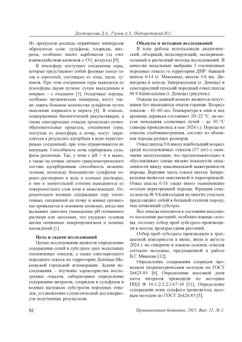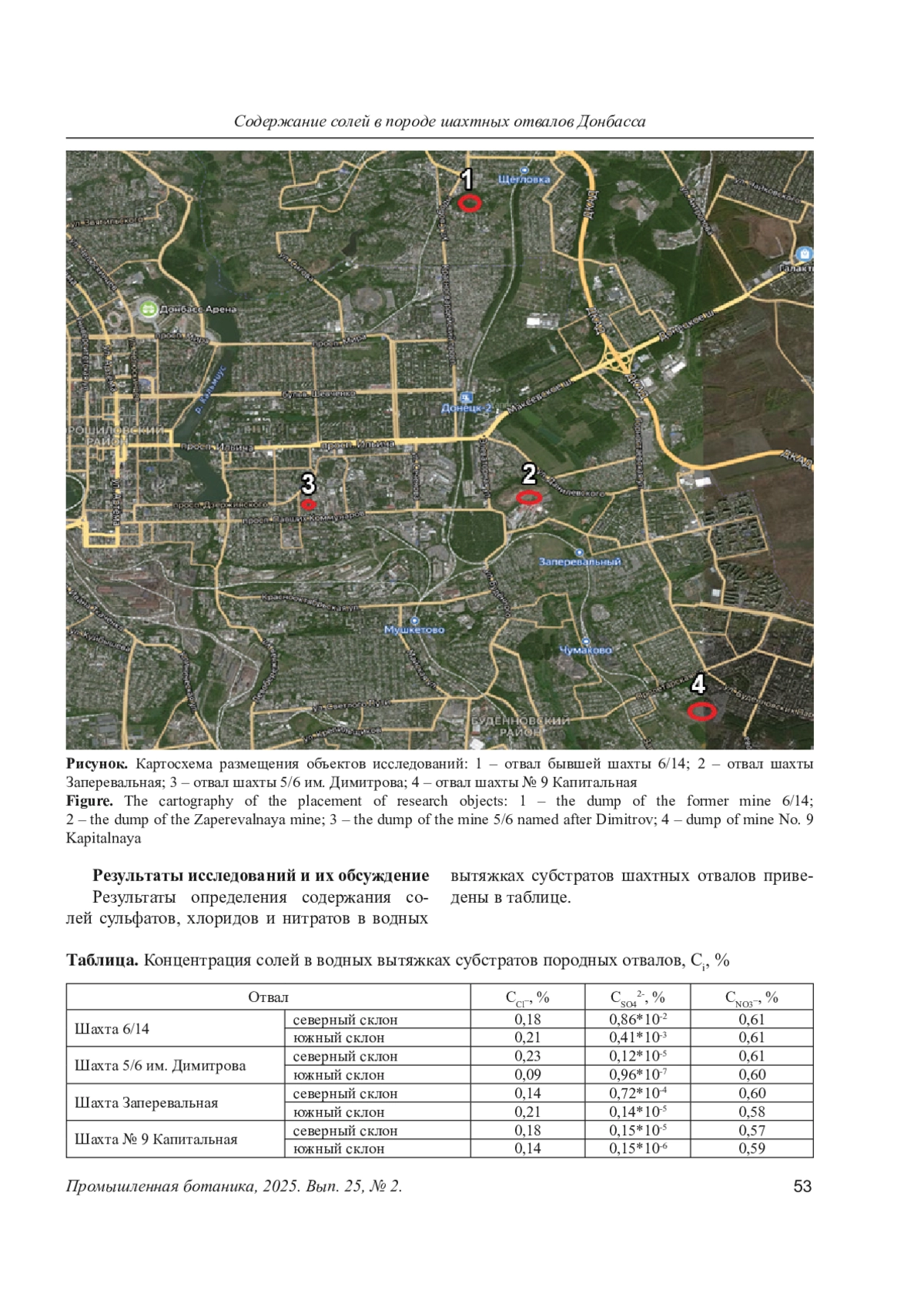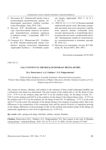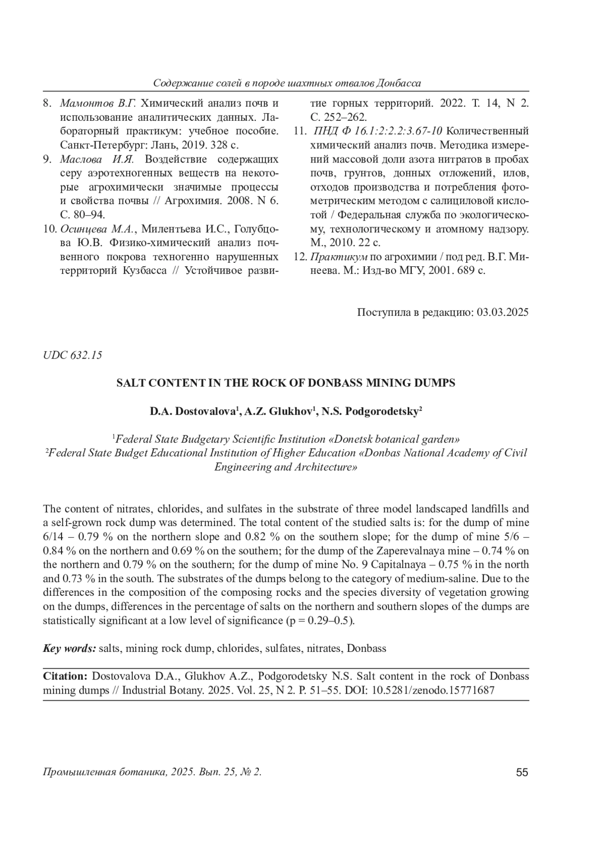 ДОСТОВАЛОВА Д. А., ГЛУХОВ А.З., ПОДГОРОДЕЦКИЙ Н. С. СОДЕРЖАНИЕ СОЛЕЙ В ПОРОДЕ ШАХТНЫХ ОТВАЛОВ ДОНБАССА // ПРОМЫШЛЕННАЯ БОТАНИКА. 2025. № 2, ТОМ 25
