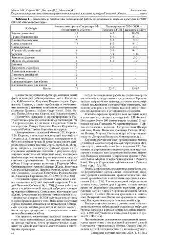 В статье приводятся результаты исследований по селекции, сортоизучению и размножению плодовых и ягодных культур за более чем 90-летний период работы научно-исследовательского института садоводства и лекарственных растений «Жигулёвские сады». По последним данным селекционерами института создано около 500 сортов плодовых, ягодных культур и винограда, из которых введены в Госреестр Российской Федерации 69 сортов и 5 клоновых подвоев. Представлены перспективные формы по 8 плодовым и ягодным культурам, отобранные селекционерами по комплексу хозяйственно-ценных признаков и адаптации к условиям Среднего Поволжья. В настоящее время все исследовательские работы в институте объединяются в два направления: выведение новых помологических сортов плодовых и ягодных культур, их размножение и внедрение в производство; разработка промышленной технологии возделывания плодовых и ягодных культур в Самарской области.