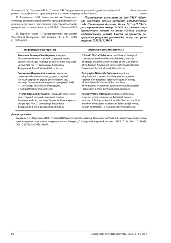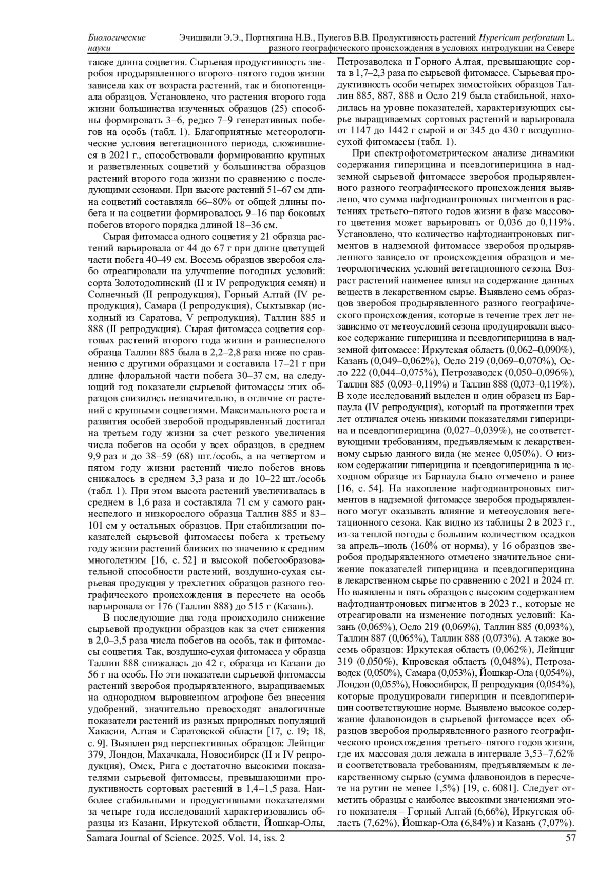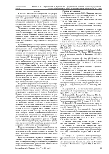 14. Эчишвили Э.Э., Портнягина Н.В., Пунегов В.В. Сравнительная морфобиологическая характеристика интродуцируемых на Севере образцов Hypericum perforatum разного географического происхождения // Самарский научный вестник. 2024. Т. 13, № 3. С. 72-80. DOI: 10.55355/snv2024133111 EDN: DOALWY