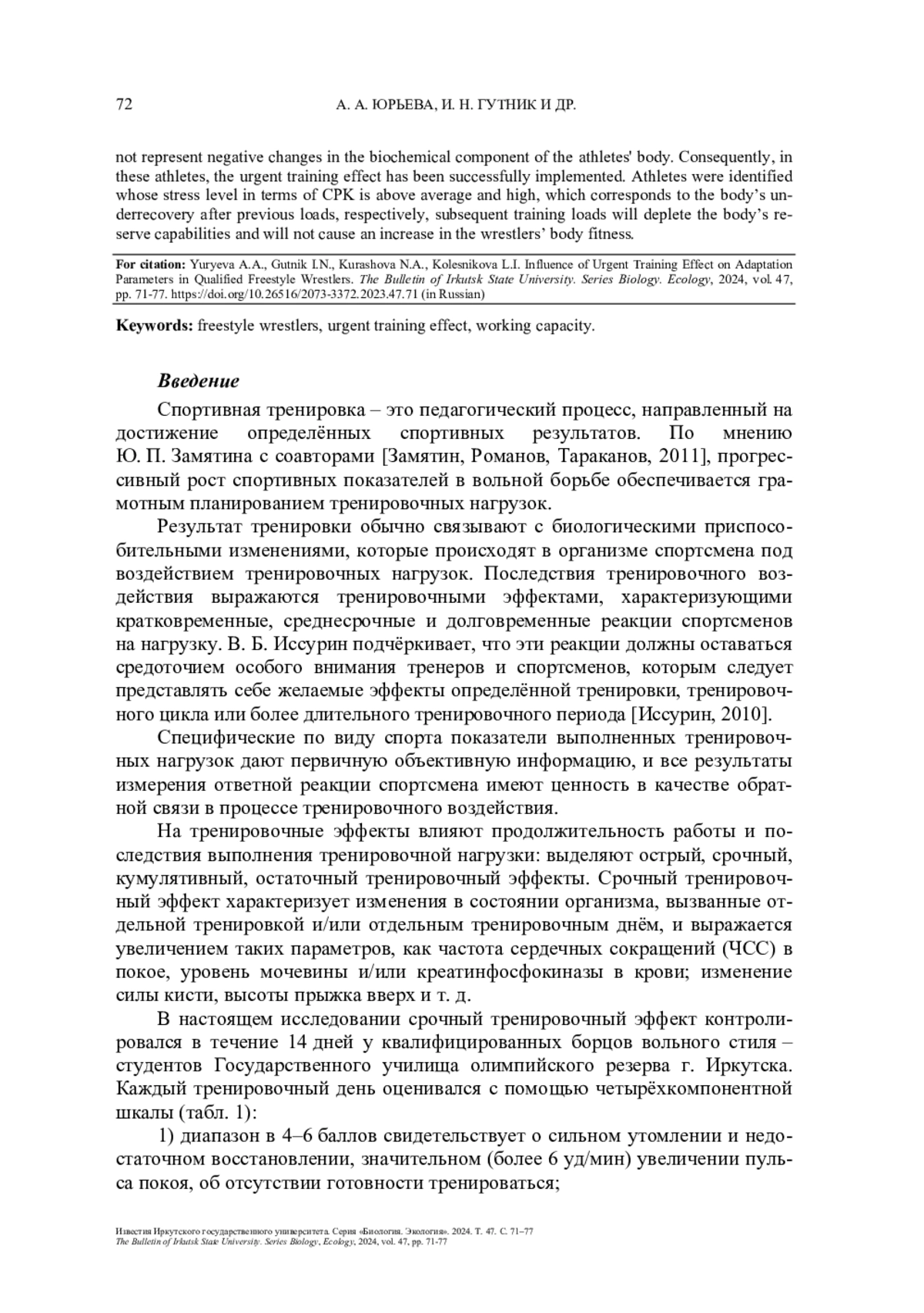 Обсуждаются результаты анализа функционального состояния квалифицированных борцов вольного стиля после срочного тренировочного эффекта, полученные по объективным и субъективным параметрам: изменению частоты сердечных сокращений, содержанию креатинфосфокиназы в крови, соотношению показателей утомление/восстановление, оценке готовности тренироваться и оценке результатов тренировочного дня тренером.