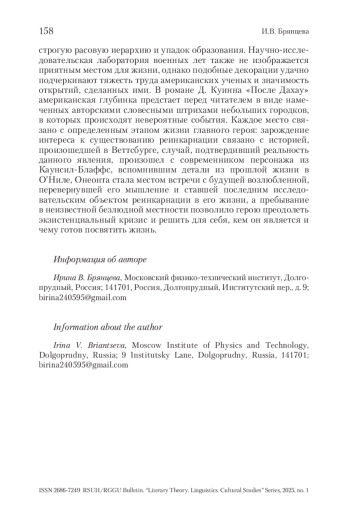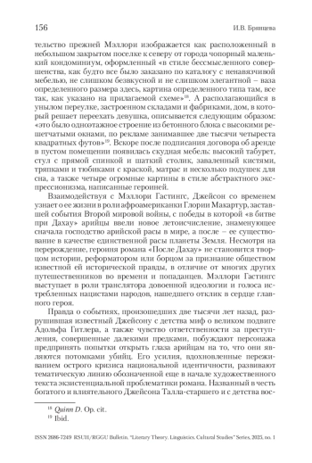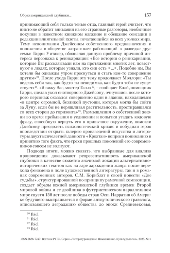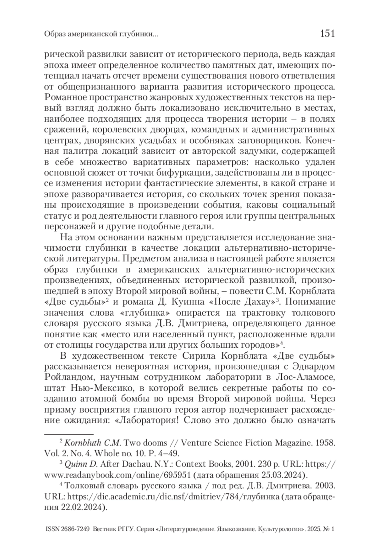 Альтернативно-исторические художественные тексты традиционно притягивают внимание исследователей и критиков в контексте создания терминологических трактовок и иных вариантов наименования, рассмотрения истоков зарождения феномена и процесса формирования данного поджанра фантастики в мировой литературе, выявления типологий и классификаций, изучения общности и различий построения сюжетов о конкретных эпохах в пределах одной и нескольких литератур, а также исследования связи альтернативной истории с другими литературными жанрами. Однако изучение специфики локализации художественного пространства жанровых произведений представляется не менее значимой задачей для исследования особенностей жанра. Данная статья посвящена рассмотрению образа американской глубинки в альтернативно-исторических произведениях о Второй мировой войне и ее последствиях. Для анализа в контексте заданной проблематики выбраны два американских художественных текста, созданных на разных этапах развития жанра: изданная в 1958 г. повесть С. М. Корнблата «Две судьбы» и увидевший свет в 2001 г. роман Д. Куинна «После Дахау». Особое внимание в статье уделяется приведению доказательных примеров о значимости глубинки как локации, активно задействованной в построении альтернативно-исторического нарратива в обоих исследуемых произведениях.