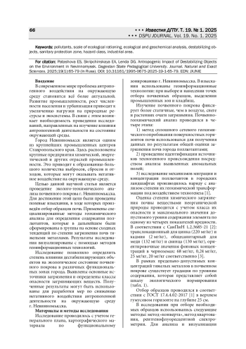 Цель. Проведение эколого-геохимического анализа почвенного покрова г. Невинномысска. Материал и методы. Материалами исследования послужили полевые изыскания: произведен отбор почвенных образцов, для последующего геохимического анализа применены специализированные методы. Для визуализации результатов использованы методы геоинформационных технологий. Картографический материал - карта функционального зонирования г. Невинномысска, генеральный план. Результаты. В исследовании определено содержание тяжелых металлов в почвенном покрове, установлена роль физико-географических параметров в распространении поллютантов, а также степень загрязненности почвенного покрова в соответствии с шкалой экологического нормирования. В соответствии с видами экономической деятельности для дестабилизирующих объектов определен класс опасности и необходимая размерность санитарно-защитной зоны. Картографический материал отображает пространственное распространение данных показателей. Выводы. Проведённое исследование наглядно демонстрирует состояние почвенного покрова в пределах промышленных и жилых районах города. Выявлены территории, где необходимо предусмотреть воссоздание природных озелененных элементов, которые будут выступать барьером на пути поллютантов.