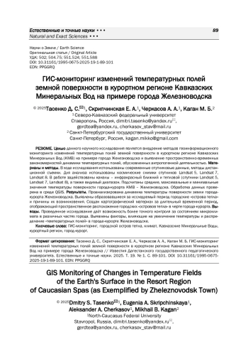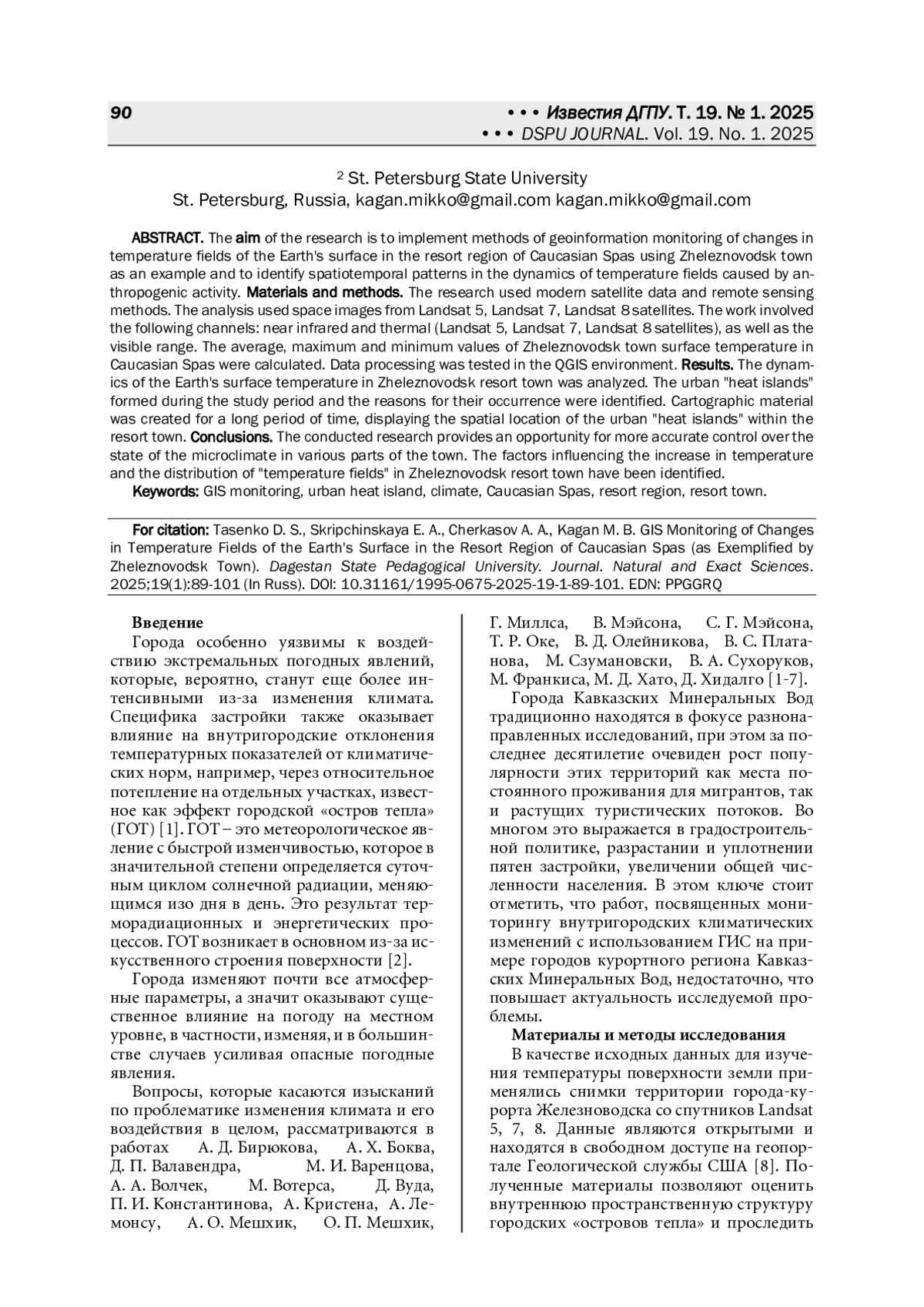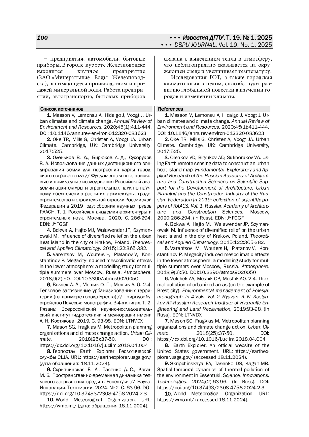 9. Скрипчинская Е. А., Тасенко Д. С., Каган М. Б. Пространственно-временная динамика теплового загрязнения среды г. Ессентуки // Наука. Инновации. Технологии. 2024. № 2. С. 63-96. DOI: 10.37493/2308-4758.2024.2.3