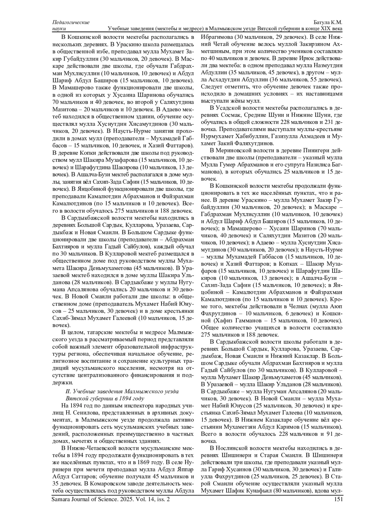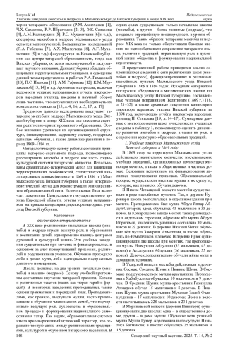 БАТУЛА К. М. УЧЕБНЫЕ ЗАВЕДЕНИЯ (МЕКТЕБЫ И МЕДРЕСЕ) В МАЛМЫЖСКОМ УЕЗДЕ ВЯТСКОЙ ГУБЕРНИИ В КОНЦЕ XIX ВЕКА // САМАРСКИЙ НАУЧНЫЙ ВЕСТНИК. 2025. ТОМ 14, № 2