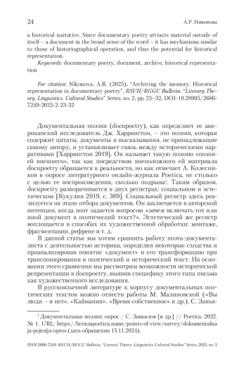 Подобно историку, для создания документальной поэзии автор производит поиск и отбор документов согласно своей авторской интенции и транспонирует их в поэтический текст. Тем самым он проводит границу, задает пространство своего «архива» – текста или цикла – и рецептивную рамку, которую В. Лехциер называет «фреймом документальности» [Лехциер 2018].
