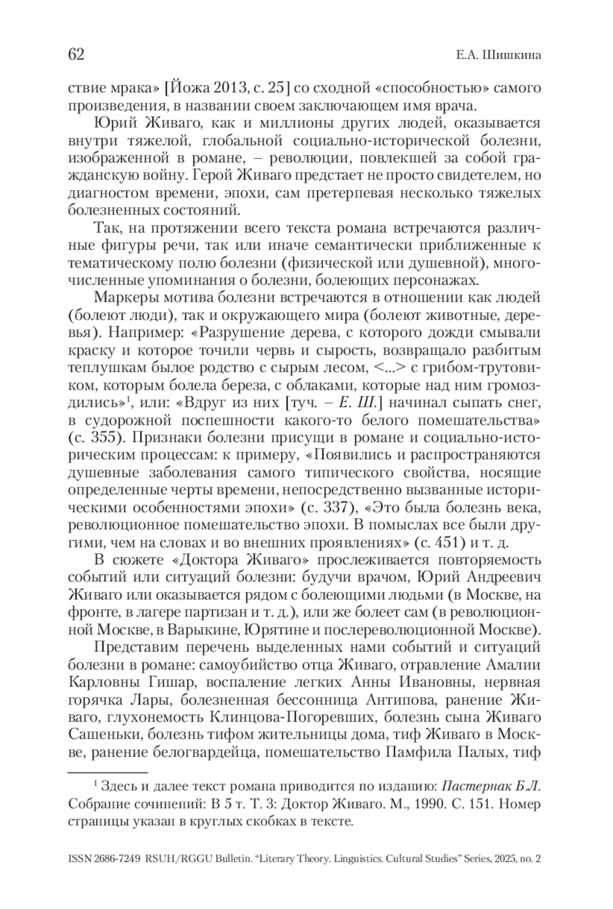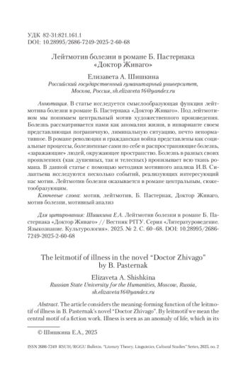В статье исследуется смыслообразующая функция лейтмотива болезни в романе Б. Пастернака «Доктор Живаго». Под лейтмотивом мы понимаем центральный мотив художественного произведения. Болезнь рассматривается нами как аномалия жизни, в инварианте своем представляющая пограничную, лиминальную ситуацию, нечто ненормативное. В романе революция и гражданская война представлены как социальные процессы, болезненные сами по себе и распространяющие болезнь, «заражающие» людей, окружающее пространство. Болезнь в разных своих проявлениях (как душевных, так и телесных) пронизывает всю ткань романа. В данной статье с помощью методики мотивного анализа И. В. Силантьева исследуются несколько событий, реализующих интересующий нас мотив. Лейтмотив болезни оказывается в романе центральным, сюжетообразующим.