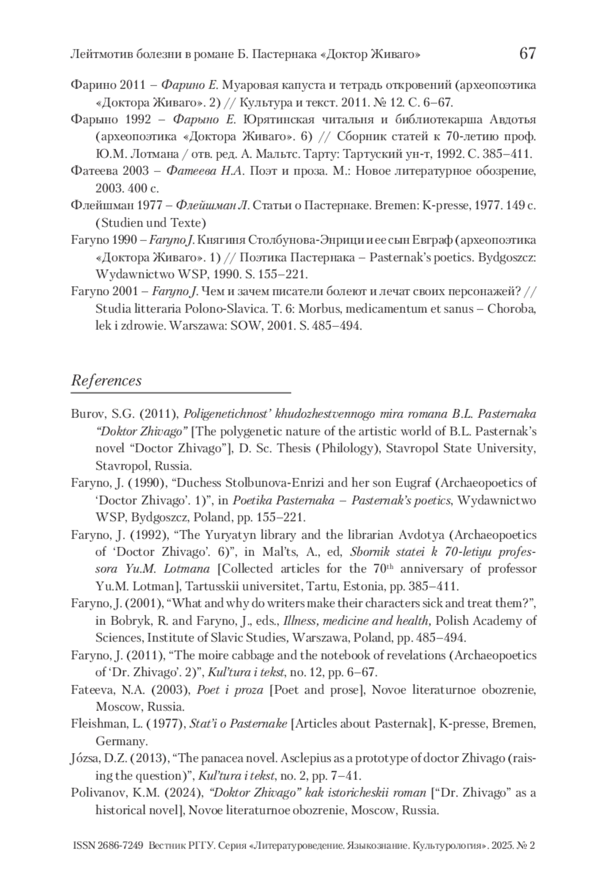 13. Faryno 2001 - Faryno J. Чем и зачем писатели болеют и лечат своих персонажей? // Studia litteraria Polono-Slavica. T. 6: Morbus, medicamentum et sanus - Choroba, lek i zdrowie. Warszawa: SOW, 2001. S. 485-494.