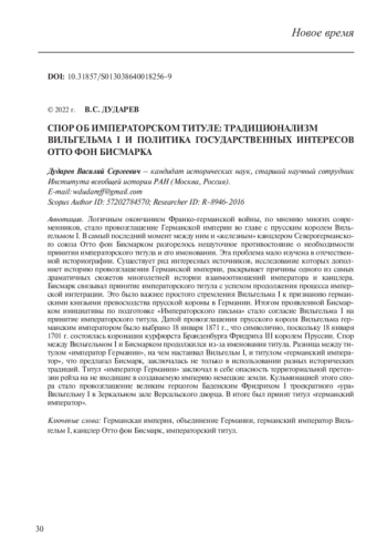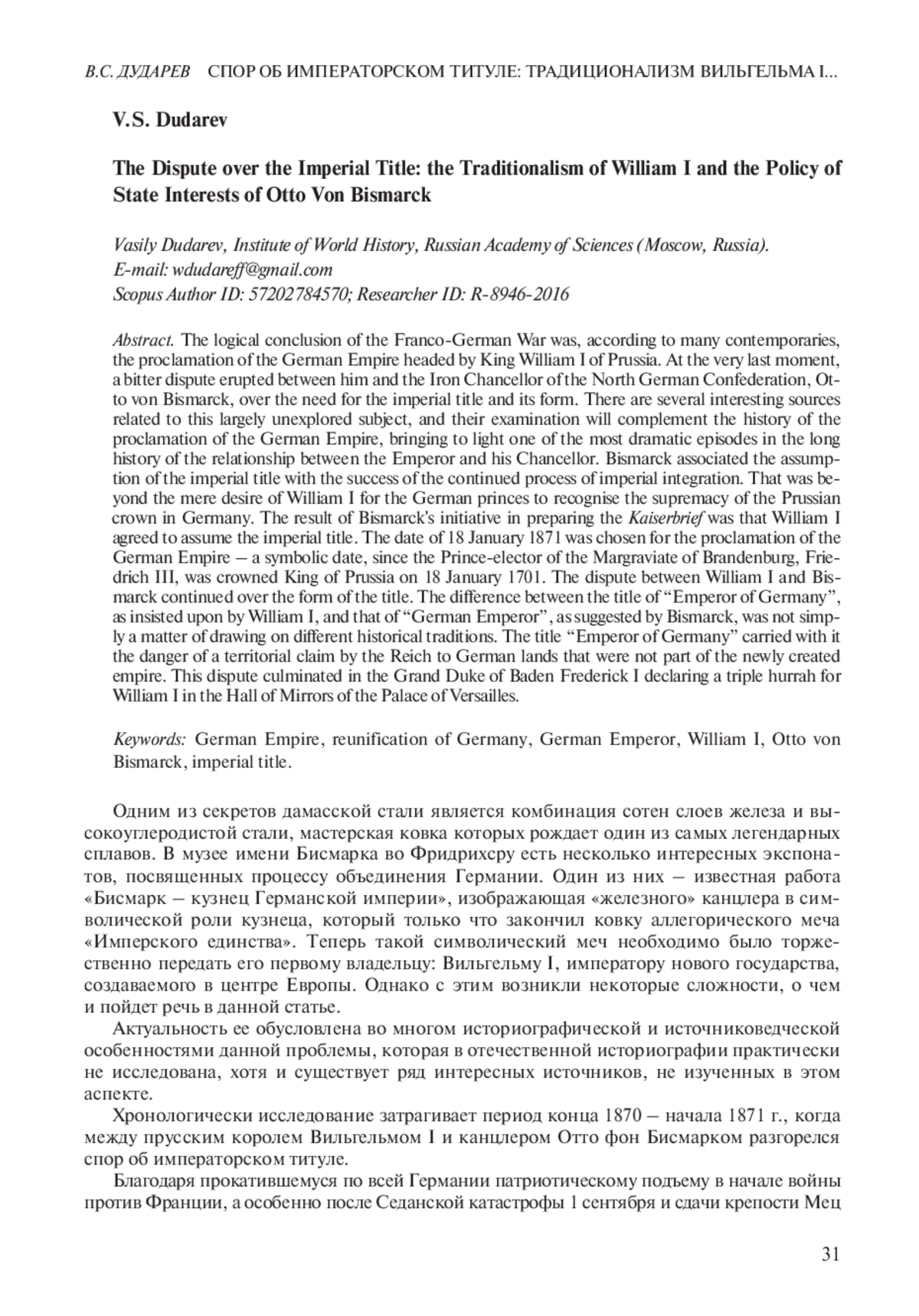 Логичным окончанием Франко-германской войны, по мнению многих современников, стало провозглашение Германской империи во главе с прусским королем Вильгельмом I. В самый последний момент между ним и «железным» канцлером Северогерманского союза Отто фон Бисмарком разгорелось нешуточное противостояние о необходимости принятия императорского титула и его именования. Эта проблема мало изучена в отечественной историографии. Существует ряд интересных источников, исследование которых дополняет историю провозглашения Германской империи, раскрывает причины одного из самых драматичных сюжетов многолетней истории взаимоотношений императора и канцлера. Бисмарк связывал принятие императорского титула с успехом продолжения процесса имперской интеграции. Это было важнее простого стремления Вильгельма I к признанию германскими князьями превосходства прусской короны в Германии. Итогом проявленной Бисмарком инициативы по подготовке «Императорского письма» стало согласие Вильгельма I на принятие императорского титула. Датой провозглашения прусского короля Вильгельма германским императором было выбрано 18 января 1871 г., что символично, поскольку 18 января 1701 г. состоялась коронация курфюрста Бранденбурга Фридриха III королем Пруссии. Спор между Вильгельмом I и Бисмарком продолжился из-за именования титула. Разница между титулом «император Германии», на чем настаивал Вильгельм I, и титулом «германский император», что предлагал Бисмарк, заключалась не только в использовании разных исторических традиций. Титул «император Германии» заключал в себе опасность территориальной претензии рейха на не входящие в создаваемую империю немецкие земли. Кульминацией этого спора стало провозглашение великим герцогом Баденским Фридрихом I троекратного «ура» Вильгельму I в Зеркальном зале Версальского дворца. В итоге был принят титул «германский император»