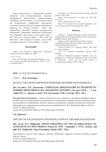 БЕЛОЗЁРОВ В. К. ИСКУССТВО ПЕРЕГОВОРОВ И РЕШЕНИЕ БЕРЛИНСКОГО ВОПРОСА (Р. В. ДОЛГИЛЕВИЧ. СОВЕТСКАЯ ДИПЛОМАТИЯ НА ЧЕТЫРЕХСТОРОННИХ ПЕРЕГОВОРАХ ПО ЗАПАДНОМУ БЕРЛИНУ (26 МАРТА 1970 Г. - 3 СЕНТЯБРЯ 1971 Г.) / ПРЕДИСЛ. И ПУБЛ. Р. В. ДОЛГИЛЕВИЧ. СПБ., 2021) // НОВАЯ И НОВЕЙШАЯ ИСТОРИЯ. 2022. № 1
