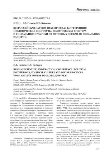 13–14 мая 2021 г. в Самарском филиале Московского городского педагогического университета состоялась II Всероссийская научно-практическая конференция «Политические институты, политическая культура и социальные практики от античных держав до глобальных империй», посвященная памяти известного самарского историка проф. С. Б. Семёнова (1954–2018) 1. Главной сферой его научных интересов было изучение развития политической мысли и парламентаризма в Британии2. Конференция, прошедшая в очном и онлайн-формате, объединила более 40 участников из Самары, Москвы, Владимира, Орла, Рязани и Саратова, а также Уральска (Казахстан)