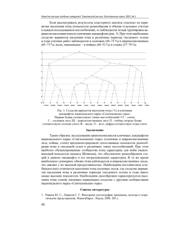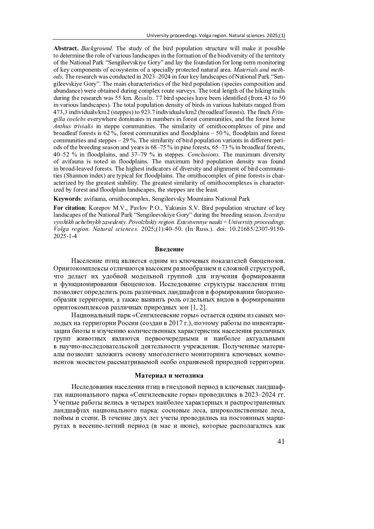 Актуальность и цели. Исследование структуры населения птиц позволит определить роль различных ландшафтов в формировании биоразнообразия территории национального парка «Сенгилеевские горы» и заложить основу многолетнего мониторинга ключевых компонентов экосистем особо охраняемой природной территории. Материалы и методы. Исследования проводились в 2023–2024 гг. в четырех ключевых ландшафтах национального парка «Сенгилеевские горы». Основные характеристики населения птиц (видовой состав и обилие) получены в ходе комплексных маршрутных учетов. Суммарная протяженность пеших учетных маршрутов в ходе исследований составила 55 км. Результаты. Выявлено 77 видов птиц (от 43 до 50 в различных ландшафтах). Суммарная плотность населения птиц в различных местообитаниях варьировала от 473,3 (степи) до 923,7 ос/км² (широколиственные леса). В лесных сообществах повсеместно доминирует по численности зяблик Fringilla coelebs, в степных сообществах – лесной конек Anthus trivialis. Сходство орнитокомплексов сосновых и широколиственных лесов составляет 62 %, лесных сообществ и пойм – 50 %, пойменных и лесных сообществ и степей – 29 %. Сходство вариантов населения птиц в различные периоды гнездового сезона и годы в сосновых – 68–75 %, в широколиственных лесах – 65–73 %, в поймах – 40–52 %, в степях – 37–79 %. Выводы. Максимальное разнообразие орнитофауны отмечено в поймах. Максимальная плотность населения птиц выявлена в широколиственных лесах. Наибольшие показатели разнообразия и выравненности сообществ птиц (индекс Шеннона) характерны для пойм. Наибольшей стабильностью отличается орнитокомплекс сосновых лесов. Наибольшим сходством орнитокомплексов характеризуются лесные и пойменные ландшафты, наименьшим – степи.