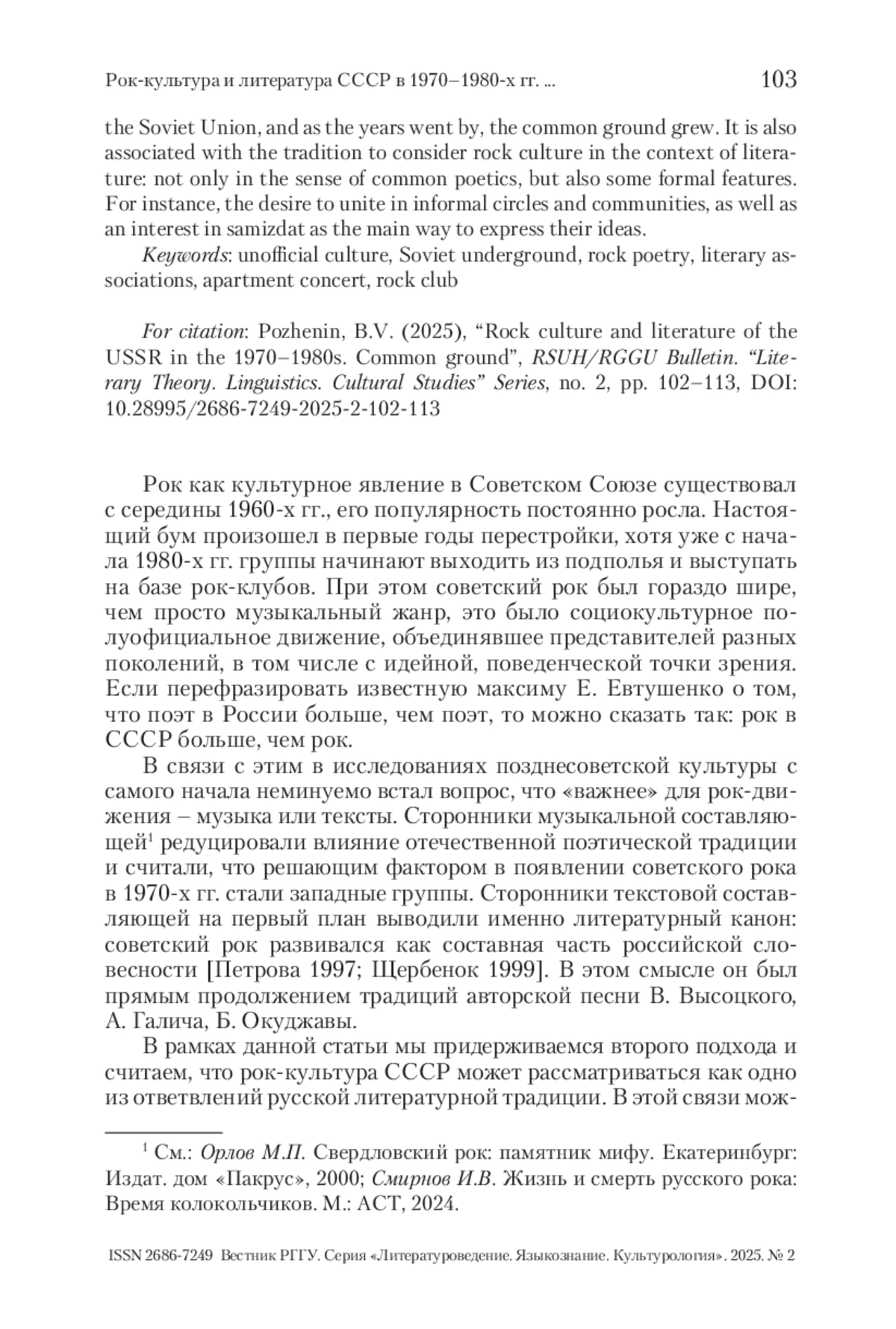 Цель статьи – прояснить социокультурные связи между участниками рок-сообщества (музыкантами, фанатами, журналистами) и представителями литературного процесса (поэтами, писателями, критиками) в позднем СССР. Некоторая общность между этими группами присутствовала с самого начала распространения рока в Советском Союзе, и с годами точек соприкосновения становилось все больше. C этим связана традиция рассматривать рок-культуру в контексте литературы: не только в смысле общей поэтики, но и формальных признаков. Среди них – стремление объединяться в неформальные кружки и сообщества, а также интерес к самиздату как основному способу трансляции своих идей.