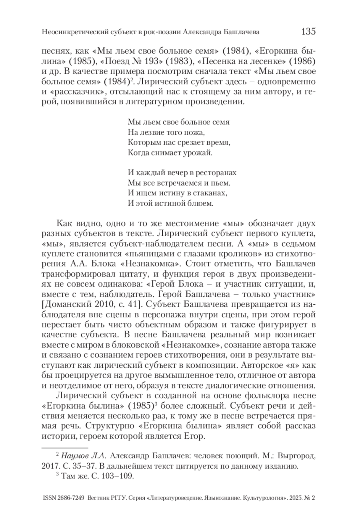 В статье рассматриваются типы и особенности неосинкретического субъекта в творчестве А. Башлачева. Неосинкретический субъект – это форма субъектной организации, проявляющаяся в отсутствии четких границ между носителем точки зрения, субъектом действия и носителем речи. В данной статье анализируются тексты Башлачева, в которых лирический субъект неопределен. Одно и то же местоимение «я» или «мы» может обозначать разных субъектов, также и может выходить за пределы времени и пространства, самоотчуждаясь в двух ипостасях. Такая неустойчивость субъекта является результатом нерасчлененности и неслиянности автора и героя.