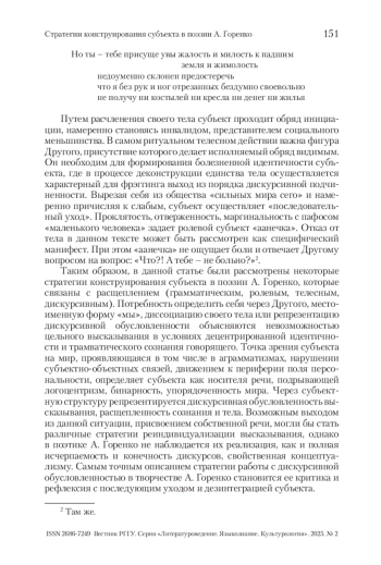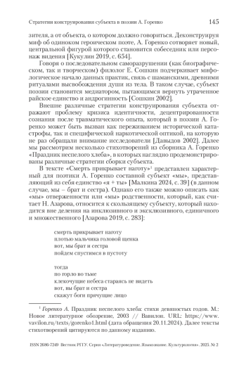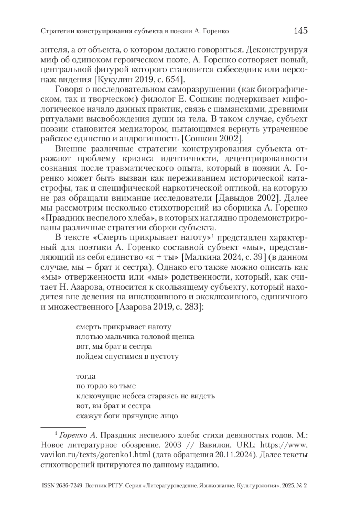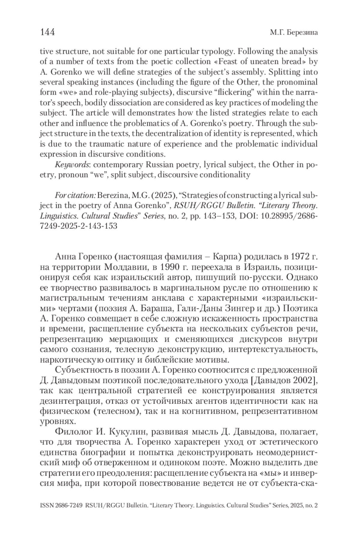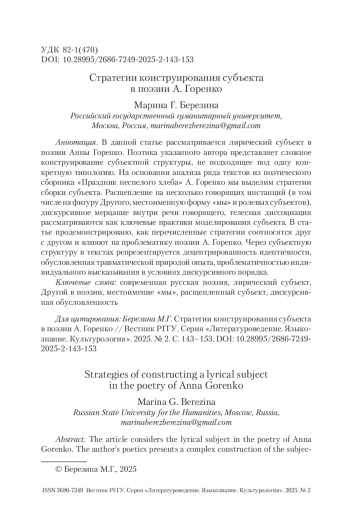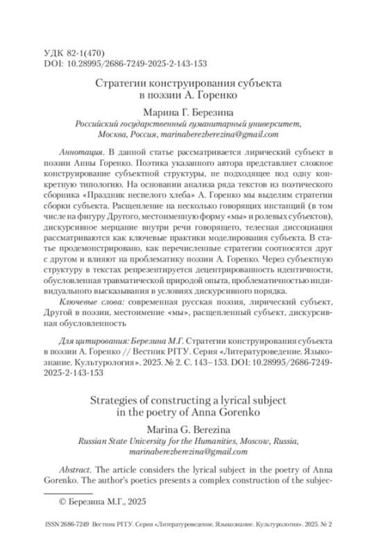 В данной статье рассматривается лирический субъект в поэзии Анны Горенко. Поэтика указанного автора представляет сложное конструирование субъектной структуры, не подходящее под одну конкретную типологию. На основании анализа ряда текстов из поэтического сборника «Праздник неспелого хлеба» А. Горенко мы выделим стратегии сборки субъекта. Расщепление на несколько говорящих инстанций (в том числе на фигуру Другого, местоименную форму «мы» и ролевых субъектов), дискурсивное мерцание внутри речи говорящего, телесная диссоциация рассматриваются как ключевые практики моделирования субъекта. В статье продемонстрировано, как перечисленные стратегии соотносятся друг с другом и влияют на проблематику поэзии А. Горенко. Через субъектную структуру в текстах репрезентируется децентрированность идентичности, обусловленная травматической природой опыта, проблематичностью индивидуального высказывания в условиях дискурсивного порядка.
