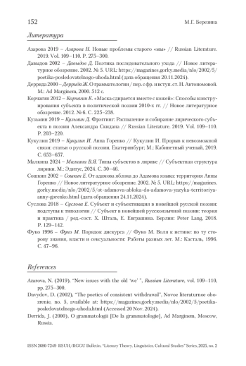 9. Суслова 2018 - Суслова Е. Субъект и субъективация в новейшей русской поэзии: подступы к типологии // Субъект в новейшей русскоязычной поэзии: теория и практика / ред.-сост. Х. Шталь, Е. Евграшина. Берлин: Peter Lang, 2018. P. 129-142.