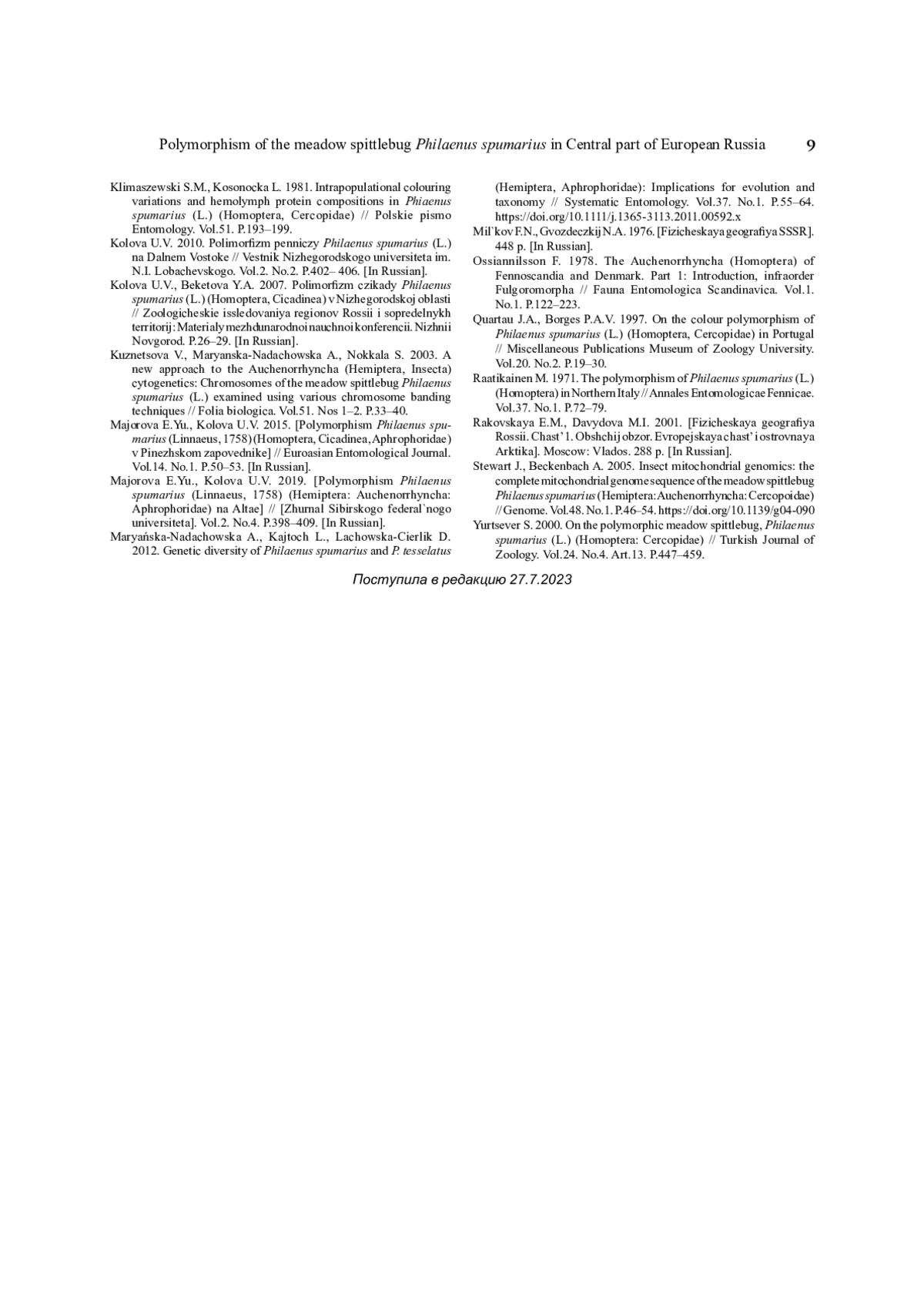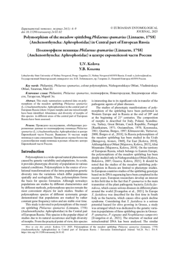 KOLOVA U.V. ПОЛИМОРФИЗМ ПЕННИЦЫ PHILAENUS SPUMARIUS (LINNAEUS, 1758) (AUCHENORRHYNCHA: APHROPHORIDAE) В ЦЕНТРЕ ЕВРОПЕЙСКОЙ ЧАСТИ РОССИИ // ЕВРАЗИАТСКИЙ ЭНТОМОЛОГИЧЕСКИЙ ЖУРНАЛ. 2025. № 1, ТОМ 24