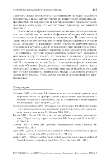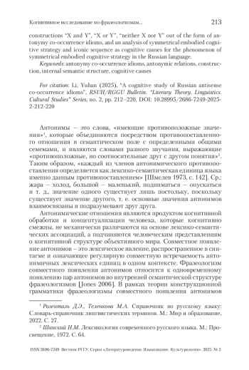 В данной статье рассмотрены фразеологизмы совместного появления антонимов, показана внутренняя семантическая структура антонимических компонентов и выявлены когнитивные причины порождения и конструирования таких фразеологизмов. Содержание исследования составляет описание трех типичных видов конструкций «X и Y», «X или Y», «ни X ни Y» из формы фразеологизмов совместного появления антонимов, а также анализ симметричной воплощенной когнитивной стратегии и иконической последовательности в качестве когнитивных причин феномена фразеологизмов совместного появления антонимов в русском языке.