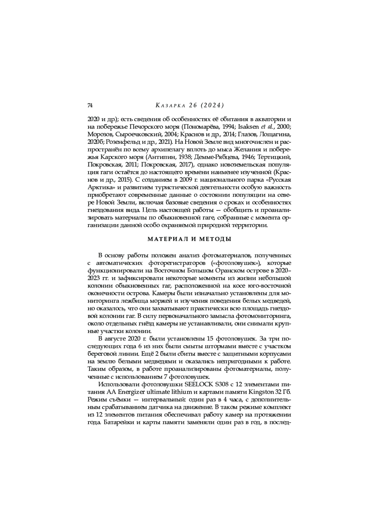 Представлены данные о распространении и биологии размножения гаги обыкновенной на севере архипелага Новая Земля, полученные в результате визуальных наблюдений в 2012–2022 годах и с помощью фотоловушек в 2020–2023 годах. Большинство гаг гнездятся колониями на небольших островах вдоль побережья с плотностью от 0,6 до 50 гнёзд/га; на побережье Северного острова было обнаружено лишь несколько гнёзд (от 0,01 до 0,1 гнёзд/га). Гагары прилетают в регион в конце мая. Инкубационный период длится с начала июня до середины августа из-за того, что самки, потерявшие первую кладку, откладывают яйца повторно. Большинство самцов покидают колонии к концу июня. Сроки отлёта гагар из региона неизвестны; некоторые из них встречаются там даже в середине октября. На кладки охотятся большой поморник ( Stercorarius skua ), сизая чайка ( Larus hyperboreus ), большая чёрная чайка ( L. marinus ) и белый медведь ( Ursus maritimus ). Хищничество песца ( Alopex lagopus ) незначительно, поскольку в период гнездования морские острова с колониями гаг для них недоступны. На успешность гнездования также влияет деятельность человека (туризм и визиты сотрудников национального парка «Русская Арктика»), которая приводит к беспокойству насиживающих птиц и способствует распространению хищников. Для оценки численности и динамики обыкновенной гаги в регионе в целом необходимо обследовать другие потенциальные места гнездования и вести постоянный мониторинг в регионе. Следует ограничить деятельность человека в местах гнездования.