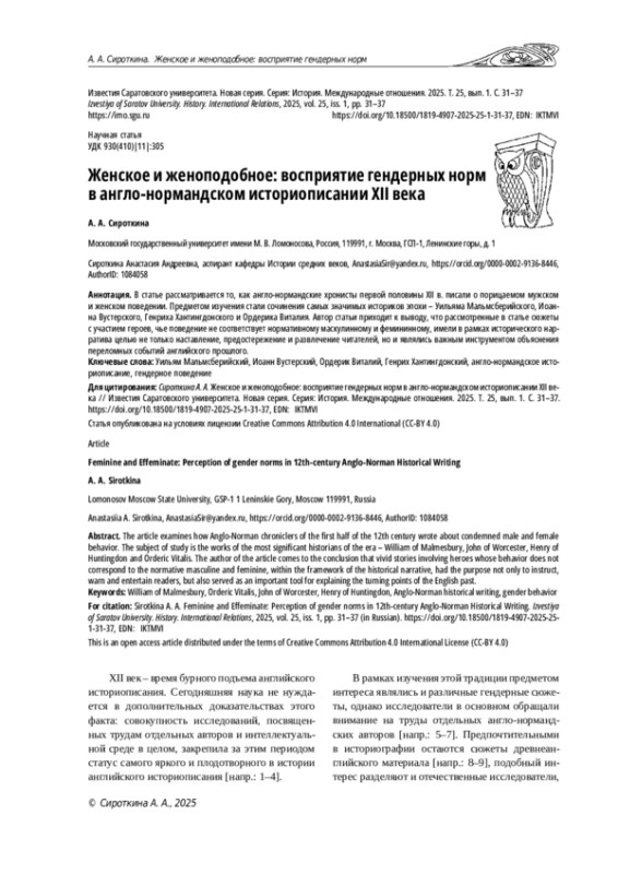 СИРОТКИНА А. А. ЖЕНСКОЕ И ЖЕНОПОДОБНОЕ: ВОСПРИЯТИЕ ГЕНДЕРНЫХ НОРМ В АНГЛО-НОРМАНДСКОМ ИСТОРИОПИСАНИИ XII ВЕКА // ИЗВЕСТИЯ САРАТОВСКОГО УНИВЕРСИТЕТА. НОВАЯ СЕРИЯ. СЕРИЯ: ИСТОРИЯ. МЕЖДУНАРОДНЫЕ ОТНОШЕНИЯ. 2025. Т. 25 № 1