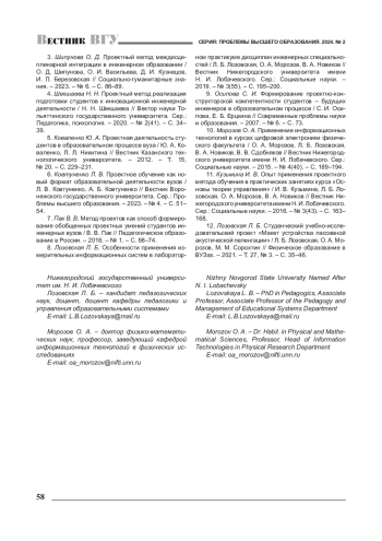 6. Ковтуненко Л. В. Проектное обучение как новый формат образовательной деятельности вузов / Л. В. Ковтуненко, А. Б. Ковтуненко // Вестник Воронежского государственного университета. Сер.: Проблемы высшего образования. - 2023. - № 4. - С. 5154. EDN: JWICPT