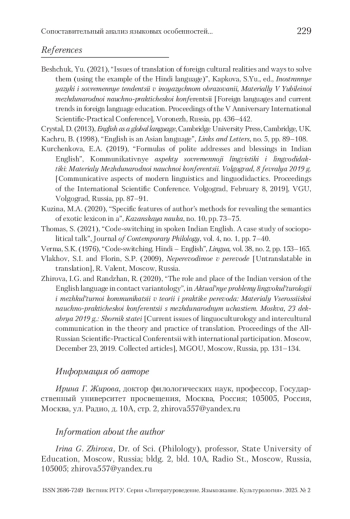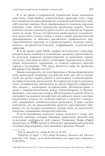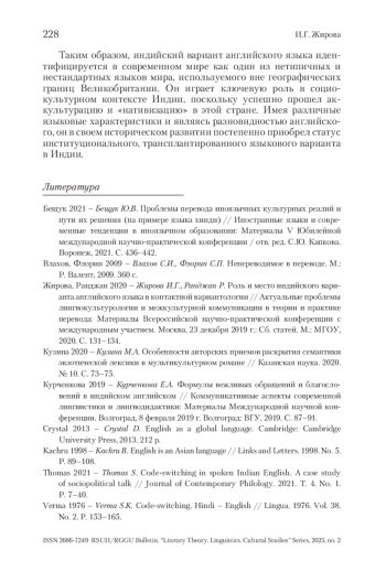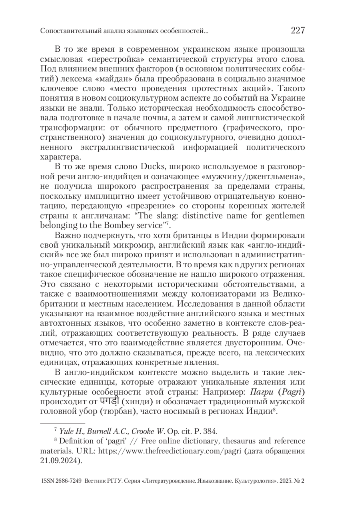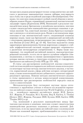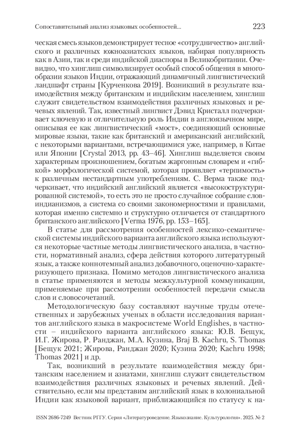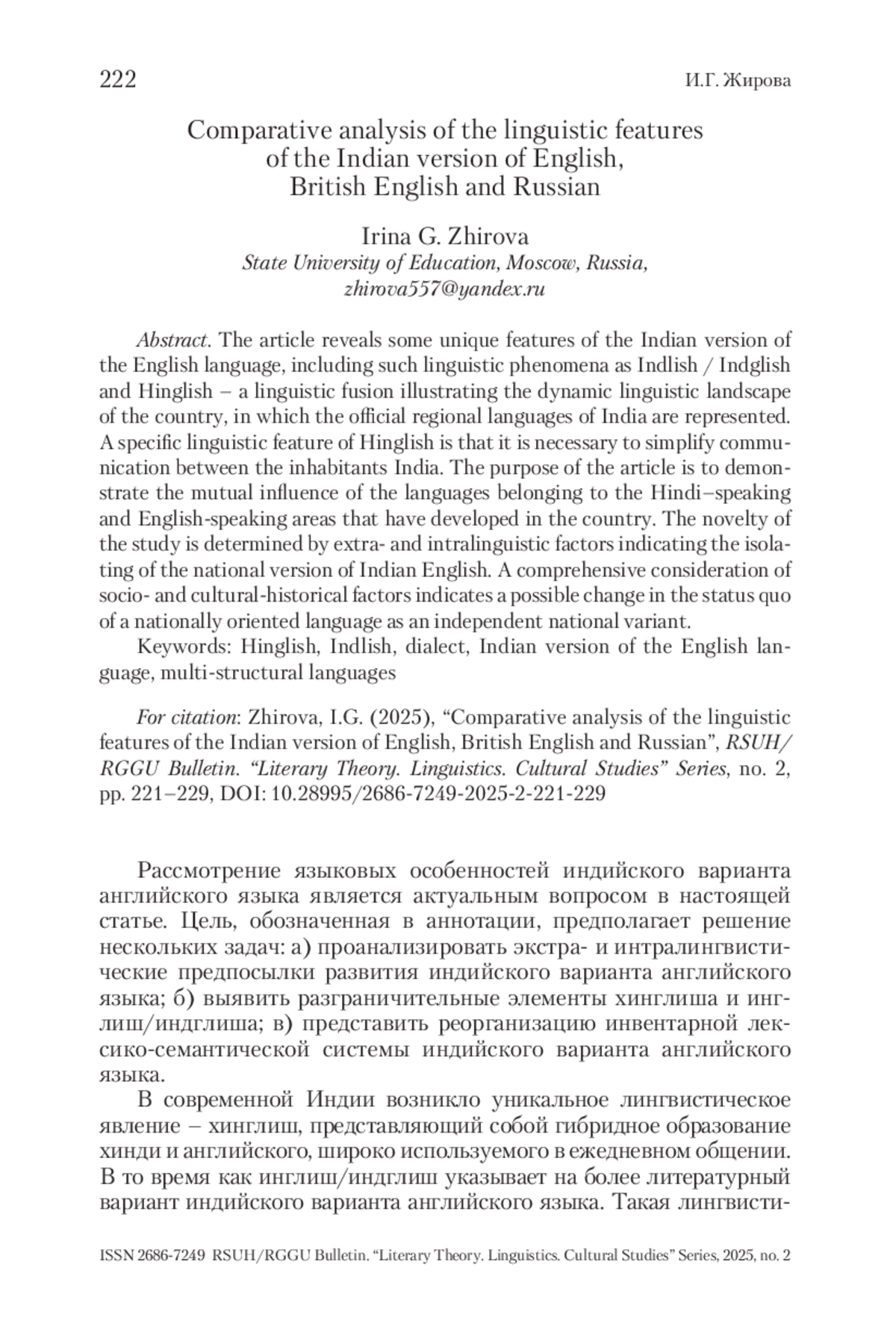 ЖИРОВА И. Г. СОПОСТАВИТЕЛЬНЫЙ АНАЛИЗ ЯЗЫКОВЫХ ОСОБЕННОСТЕЙ ИНДИЙСКОГО ВАРИАНТА АНГЛИЙСКОГО, БРИТАНСКОГО АНГЛИЙСКОГО И РУССКОГО ЯЗЫКОВ // ВЕСТНИК РГГУ. СЕРИЯ «ЛИТЕРАТУРОВЕДЕНИЕ. ЯЗЫКОЗНАНИЕ. КУЛЬТУРОЛОГИЯ». 2025. № 2