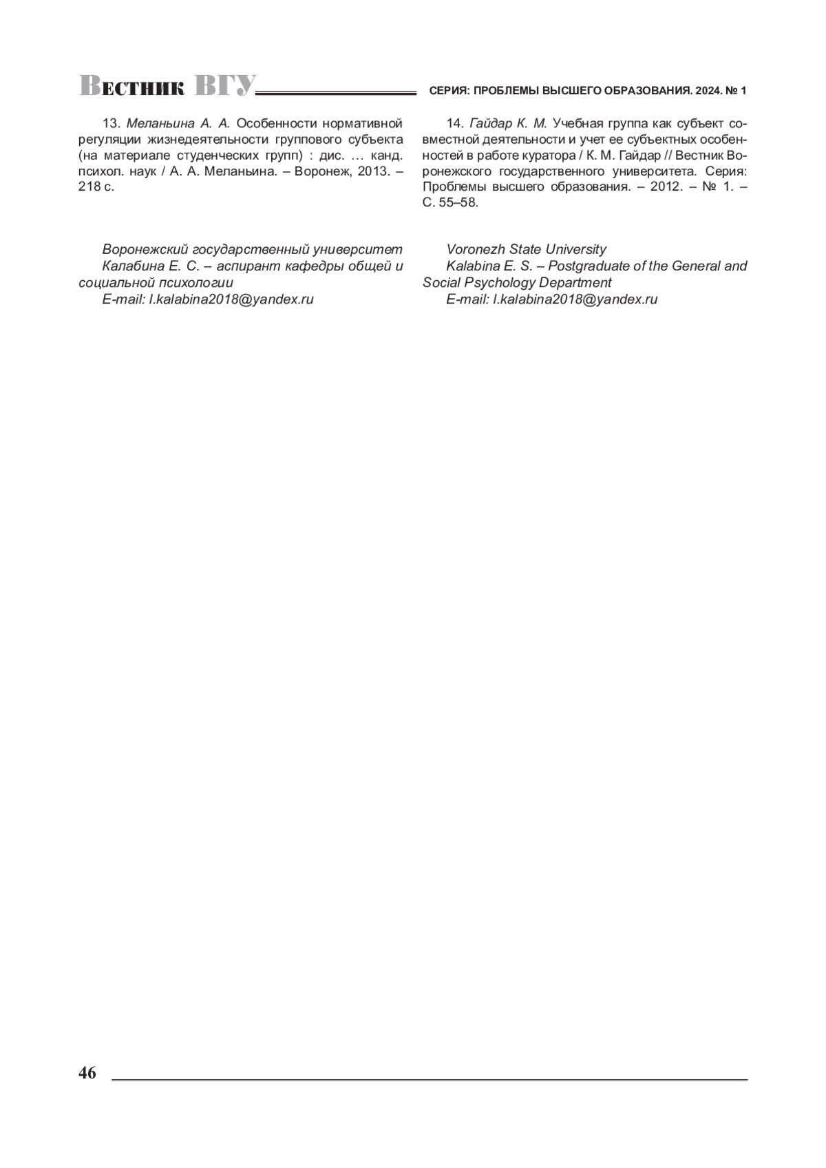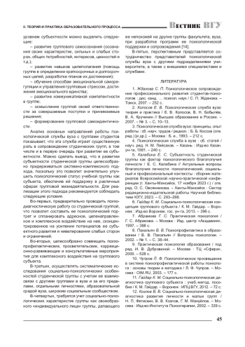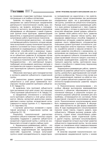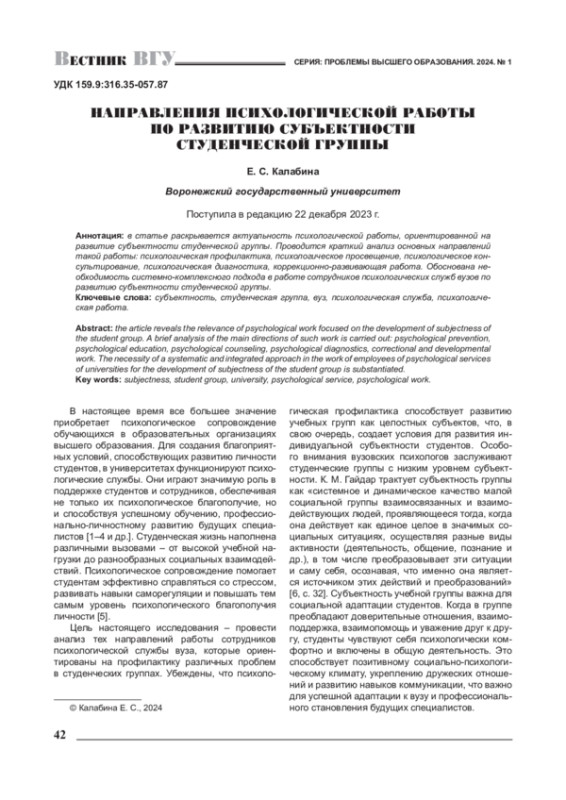КАЛАБИНА Е. С. НАПРАВЛЕНИЯ ПСИХОЛОГИЧЕСКОЙ РАБОТЫ ПО РАЗВИТИЮ СУБЪЕКТНОСТИ СТУДЕНЧЕСКОЙ ГРУППЫ // ВЕСТНИК ВОРОНЕЖСКОГО ГОСУДАРСТВЕННОГО УНИВЕРСИТЕТА. СЕРИЯ: ПРОБЛЕМЫ ВЫСШЕГО ОБРАЗОВАНИЯ. 2024. № 1