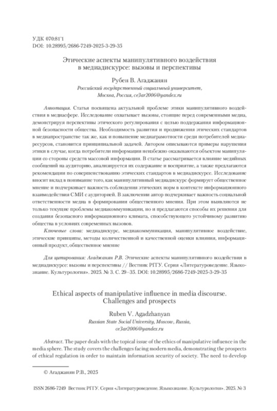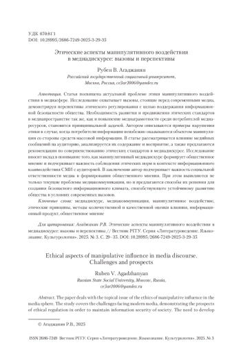 Статья посвящена актуальной проблеме этики манипулятивного воздействия в медиасфере. Исследование охватывает вызовы, стоящие перед современными медиа, демонстрируя перспективы этического регулирования с целью поддержания информационной безопасности общества. Необходимость развития и продвижения этических стандартов в медиапространстве так же, как и повышение медиаграмотности среди потребителей медиаресурсов, становится принципиальной задачей. Автором описываются примеры нарушения этики в случае, когда потребители информации неизбежно оказываются объектом манипуляции со стороны средств массовой информации. В статье рассматривается влияние медийных сообщений на аудиторию, анализируется их содержание и восприятие, а также предлагаются рекомендации по совершенствованию этических стандартов в медиадискурсе. Исследование вносит вклад в понимание того, как манипулятивный медиадискурс формирует общественное мнение и подчеркивает важность соблюдения этических норм в контексте информационного взаимодействия СМИ с аудиторией. В заключении автор подчеркивает важность социальной ответственности медиа в формировании общественного мнения. При этом выявляются не только текущие проблемы медиакоммуникации, но и предлагаются способы их решения для создания безопасного информационного климата, способствующего устойчивому развитию общества в условиях современных вызовов.