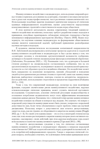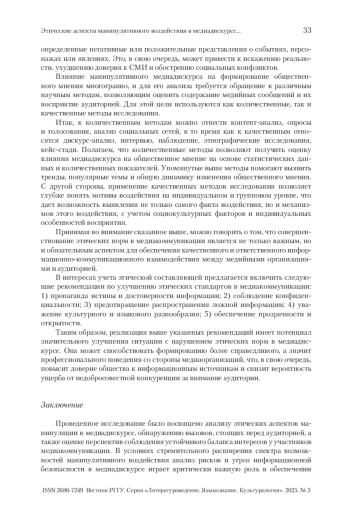 Кроме того, проблема манипулятивного влияния в медиадискурсе особенно четко актуализируется в контексте политической коммуникации и рекламы, где зачастую преследуются цели, скрытые от публики [Гнездилова 2019]. Это ставит перед журналистами, редакторами и медиаменеджерами задачу балансирования между достижением коммерческих и политических целей и соблюдением этических стандартов.
