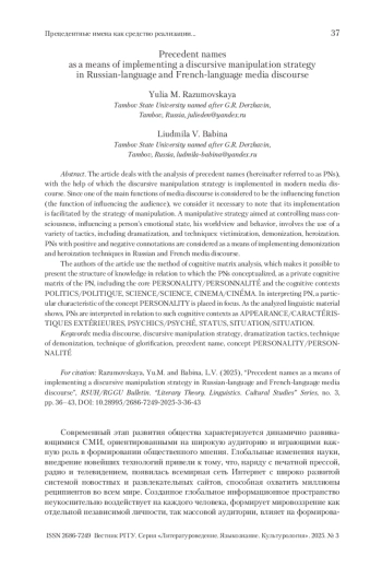 4. Разумовская, Бабина 2022 - Разумовская Ю.М., Бабина Л.В. Когнитивные основы изучения прецедентных имен (на материале русского языка) // Когнитивные исследования языка. 2022. Вып. 2 (49). С. 359-364.