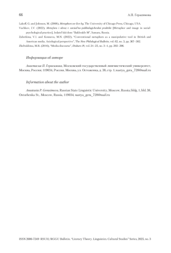 3. Желтухина 2016 - Желтухина М.Р. Медиадискурс // Дискурс-Пи. 2016. № 3-4 (24-25). C. 292-296. Заботкина, Коннова 2022 - Заботкина В.И., Коннова М.Н. Прецедентные метафоры как инструмент языковой манипуляции в англо-американском медиадискурсе: аксиологический аспект // Новый филологический вестник. 2022. № 3 (62). С. 367-382.