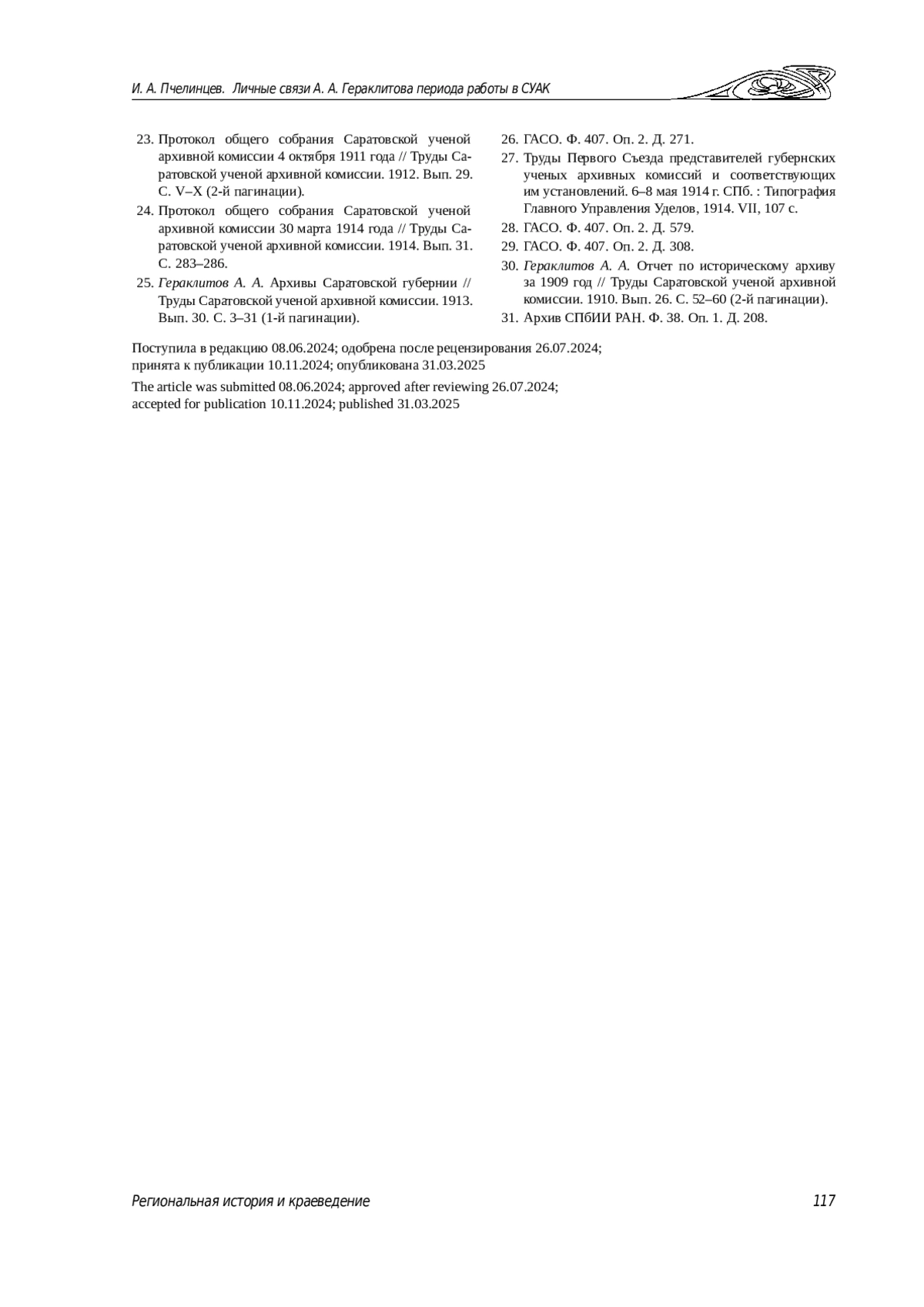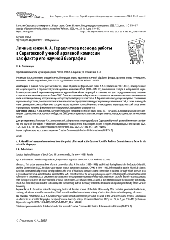ПЧЕЛИНЦЕВ И. А. ЛИЧНЫЕ СВЯЗИ А. А. ГЕРАКЛИТОВА ПЕРИОДА РАБОТЫ В САРАТОВСКОЙ УЧЕНОЙ АРХИВНОЙ КОМИССИИ КАК ФАКТОР ЕГО НАУЧНОЙ БИОГРАФИИ // ИЗВЕСТИЯ САРАТОВСКОГО УНИВЕРСИТЕТА. НОВАЯ СЕРИЯ. СЕРИЯ: ИСТОРИЯ. МЕЖДУНАРОДНЫЕ ОТНОШЕНИЯ. 2025. Т. 25 № 1