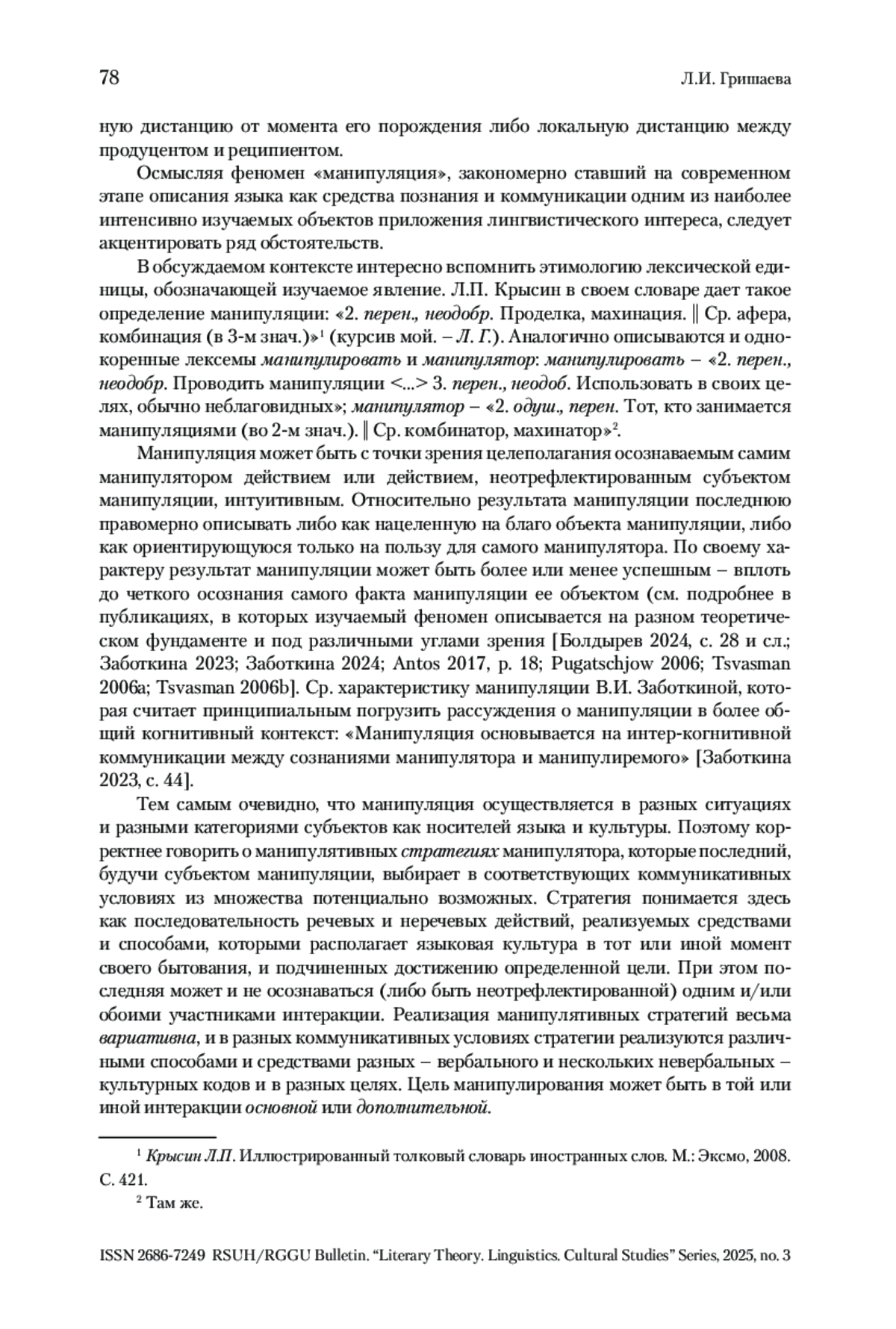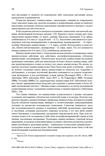 4. Заботкина 2024 - Заботкина В.И. Динамика когнитивных моделей манипуляций в медиадискурсе // Когнитивные исследования языка. Вып. 2 (58). Ч. 1. М.: Флинта, 2024. С. 48-51.
