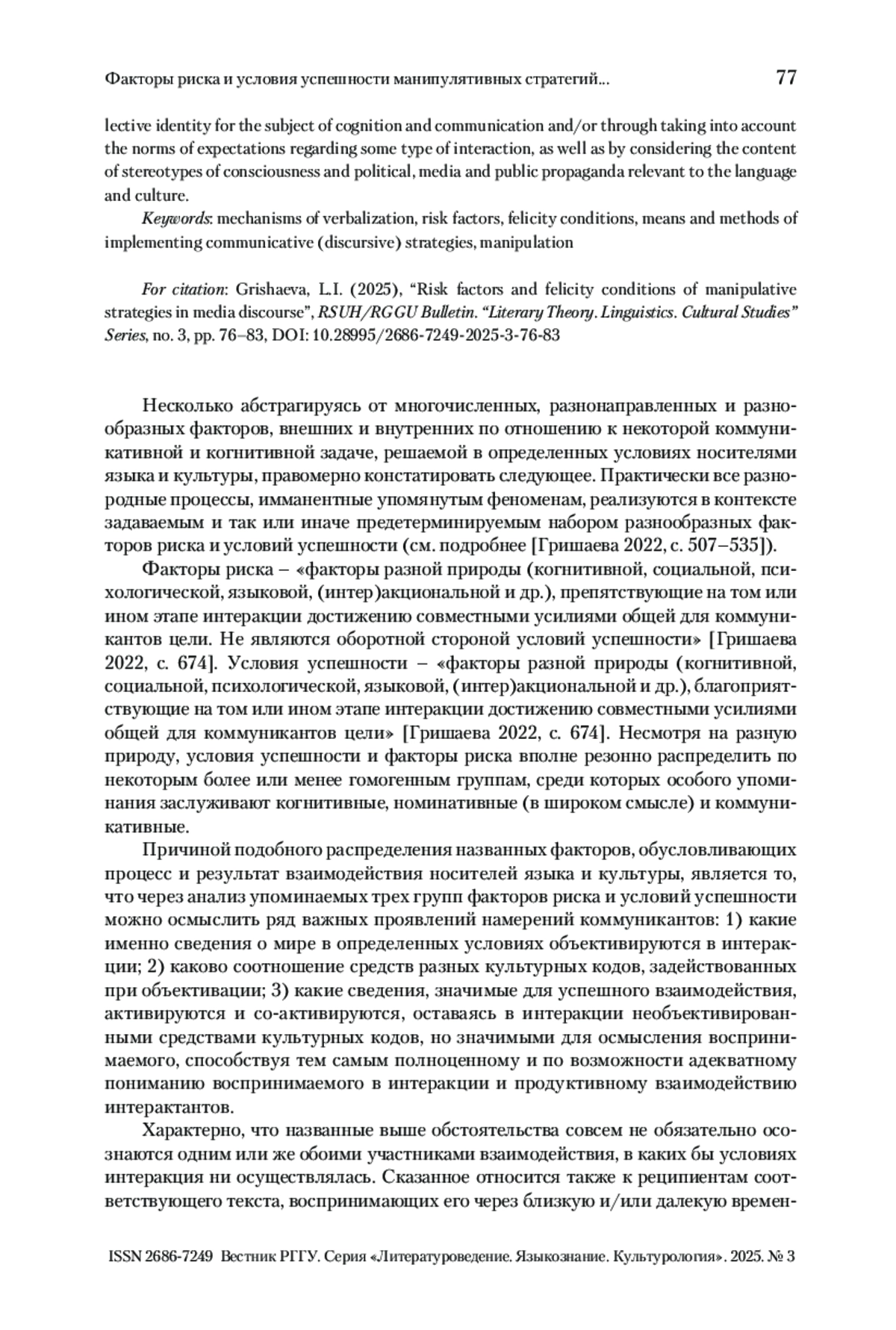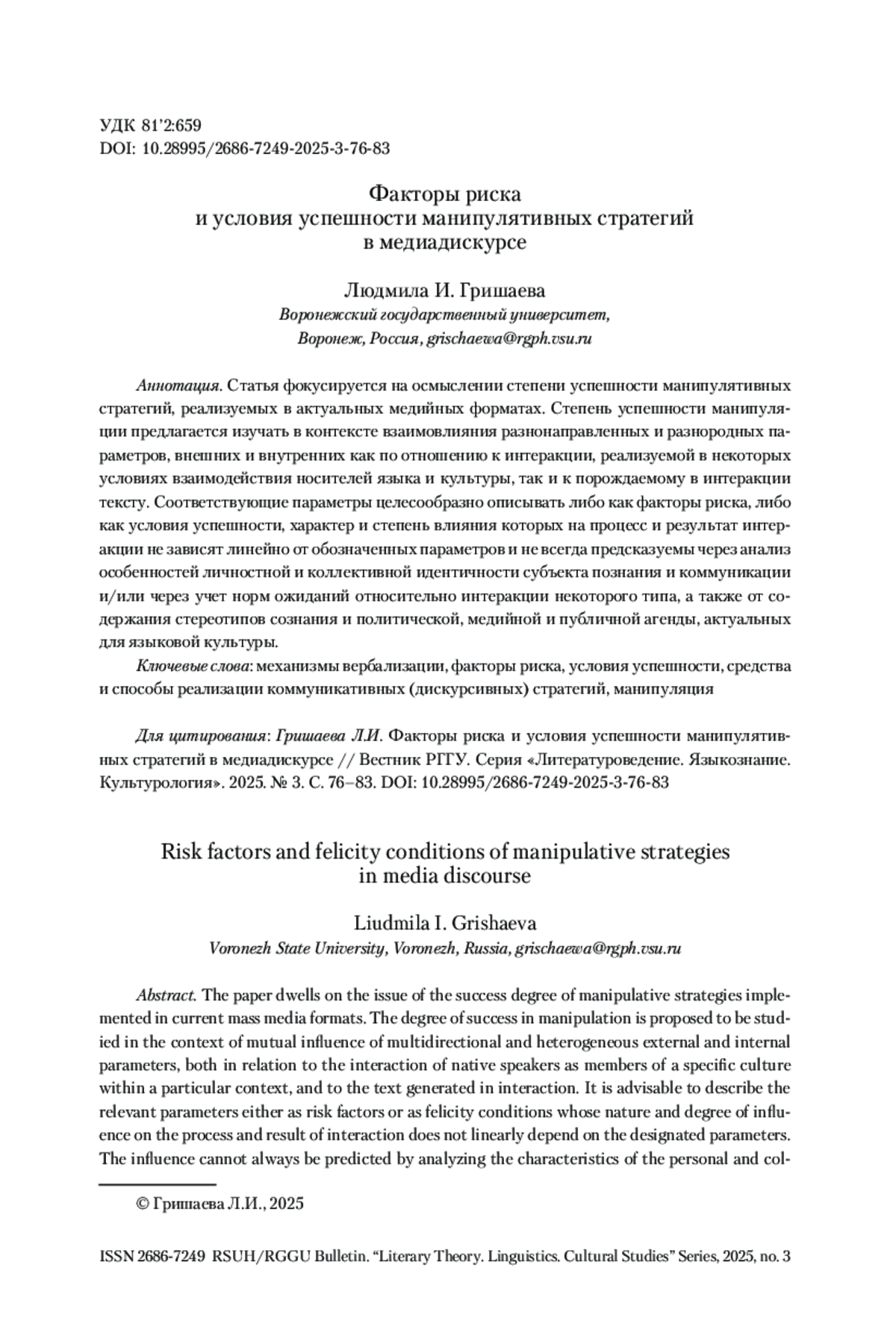 Статья фокусируется на осмыслении степени успешности манипулятивных стратегий, реализуемых в актуальных медийных форматах. Степень успешности манипуляции предлагается изучать в контексте взаимовлияния разнонаправленных и разнородных параметров, внешних и внутренних как по отношению к интеракции, реализуемой в некоторых условиях взаимодействия носителей языка и культуры, так и к порождаемому в интеракции тексту. Соответствующие параметры целесообразно описывать либо как факторы риска, либо как условия успешности, характер и степень влияния которых на процесс и результат интеракции не зависят линейно от обозначенных параметров и не всегда предсказуемы через анализ особенностей личностной и коллективной идентичности субъекта познания и коммуникации и/или через учет норм ожиданий относительно интеракции некоторого типа, а также от содержания стереотипов сознания и политической, медийной и публичной агенды, актуальных для языковой культуры.