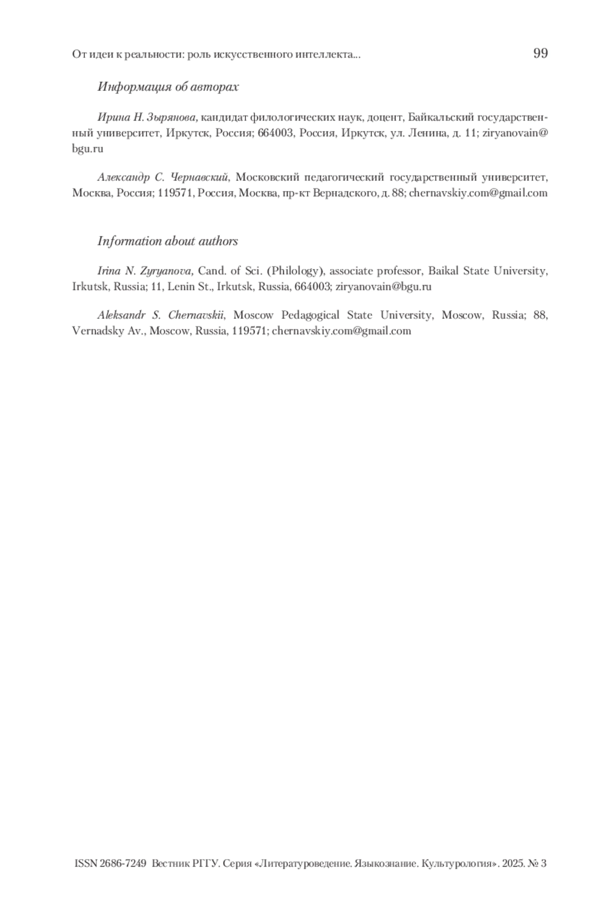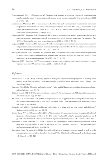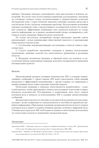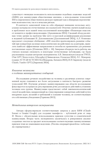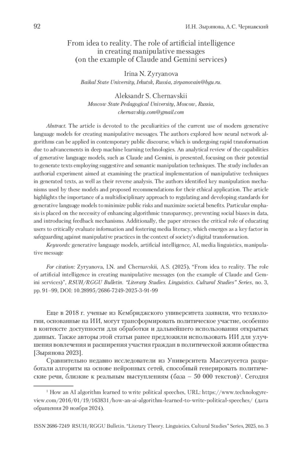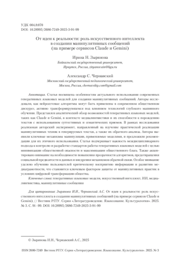 ЗЫРЯНОВА И. Н., ЧЕРНАВСКИЙ А. С. ОТ ИДЕИ К РЕАЛЬНОСТИ: РОЛЬ ИСКУССТВЕННОГО ИНТЕЛЛЕКТА В СОЗДАНИИ МАНИПУЛЯТИВНЫХ СООБЩЕНИЙ (НА ПРИМЕРЕ СЕРВИСОВ CLAUDE И GEMINI) // ВЕСТНИК РГГУ. СЕРИЯ «ЛИТЕРАТУРОВЕДЕНИЕ. ЯЗЫКОЗНАНИЕ. КУЛЬТУРОЛОГИЯ». 2025. № 3