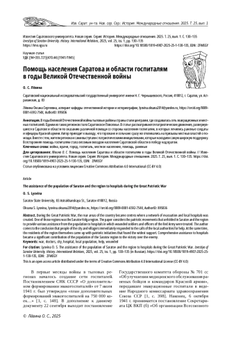 ЛЕВИНА О. С. ПОМОЩЬ НАСЕЛЕНИЯ САРАТОВА И ОБЛАСТИ ГОСПИТАЛЯМ В ГОДЫ ВЕЛИКОЙ ОТЕЧЕСТВЕННОЙ ВОЙНЫ // ИЗВЕСТИЯ САРАТОВСКОГО УНИВЕРСИТЕТА. НОВАЯ СЕРИЯ. СЕРИЯ: ИСТОРИЯ. МЕЖДУНАРОДНЫЕ ОТНОШЕНИЯ. 2025. Т. 25 № 1