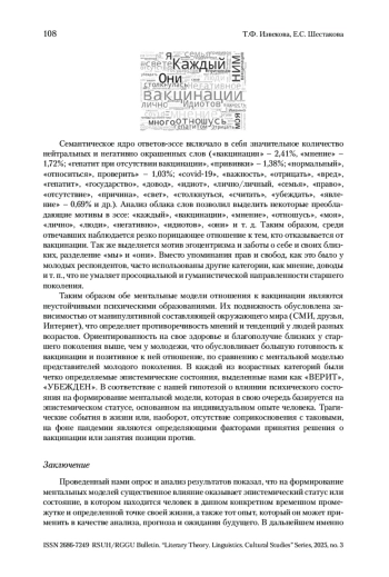 Статья посвящена анализу ментальных моделей, формирующихся в свою очередь на базе определенных эпистемических статусов у людей, принимающих решение о вакцинации от инфекционных болезней. Исследование строится на данных, полученных в ходе опроса представителей разных социальных и возрастных групп – обладателей наивного (обыденного) сознания, не имеющих специальных познаний в области медицины. Участниками дискурса авторы статьи считают не только традиционную диаду «врач-пациент», а также и авторов медиа и интернет контента, зачастую именно они являются ответственными за эпистемическое состояние индивида, которое формирует ту или иную ментальную модель по отношению к позиции доказательной и официальной медицине. В статье также производится анализ лексики участников опроса путем формирования облаков тегов.