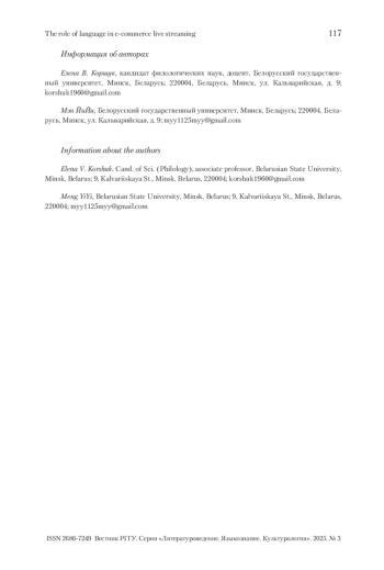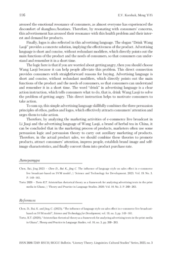 1. Chen, Bai, Jing 2023 - Chen D., Bai K., Jing C. The influence of language style on sales effect in e-commerce live broadcast-based on SVM model // Science and Technology for Development. 2023. Vol. 19. No. 3. P. 149-161.