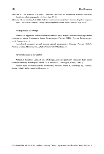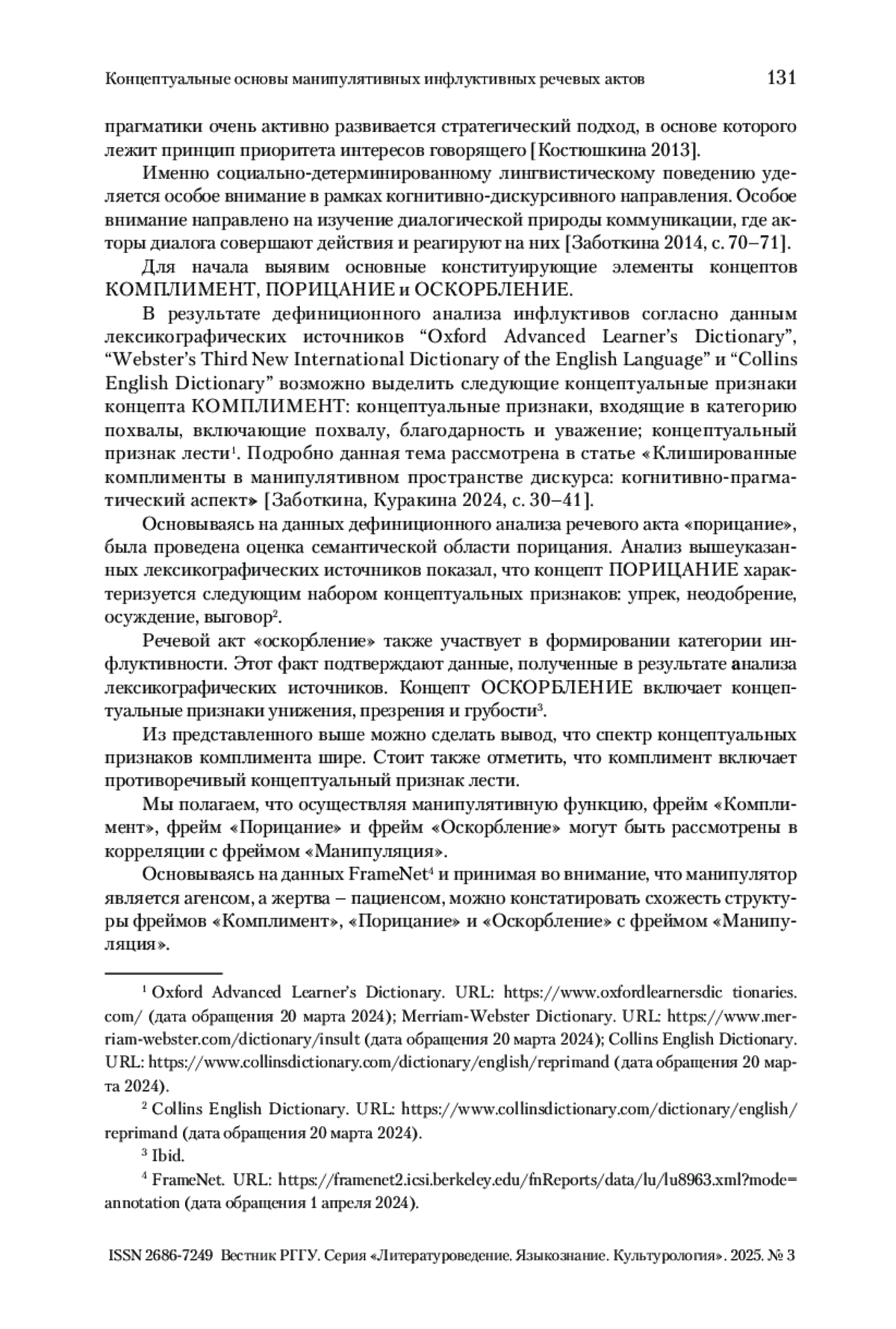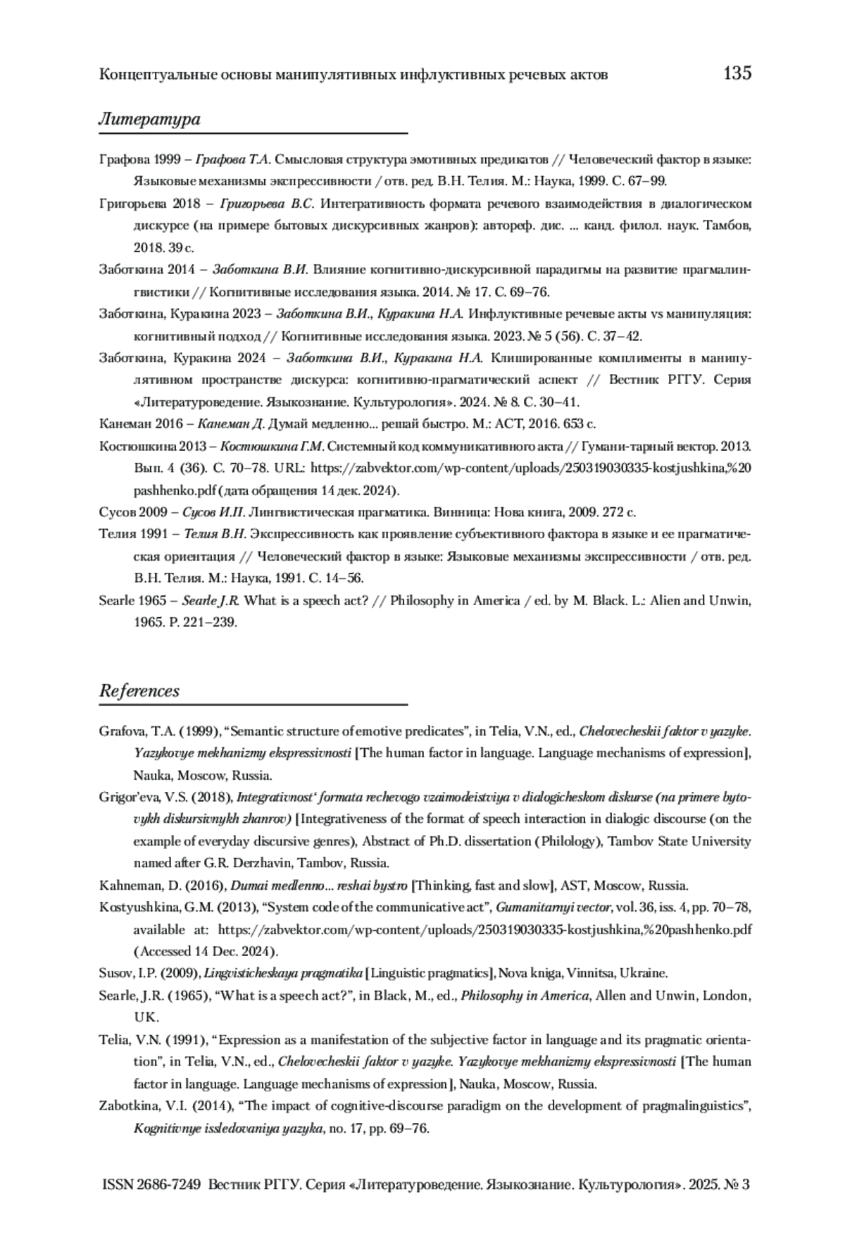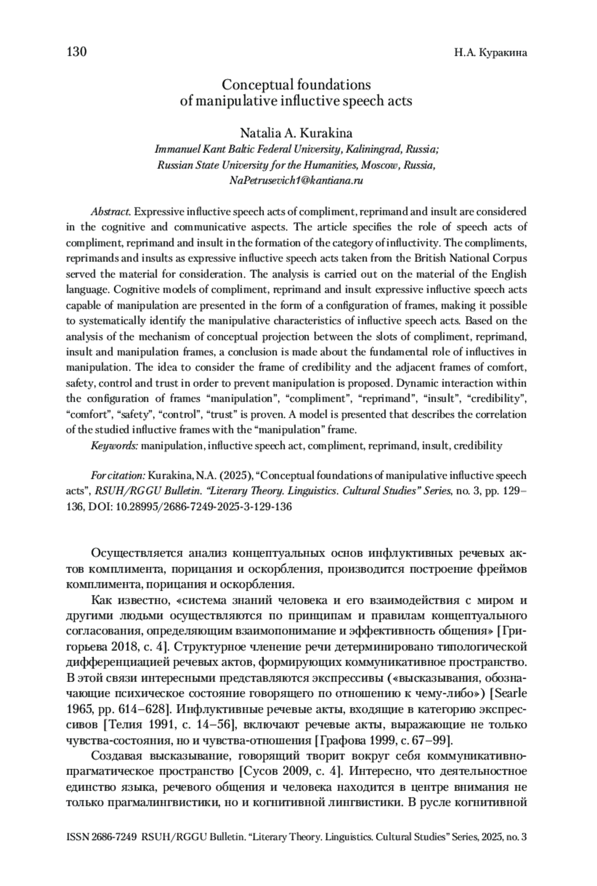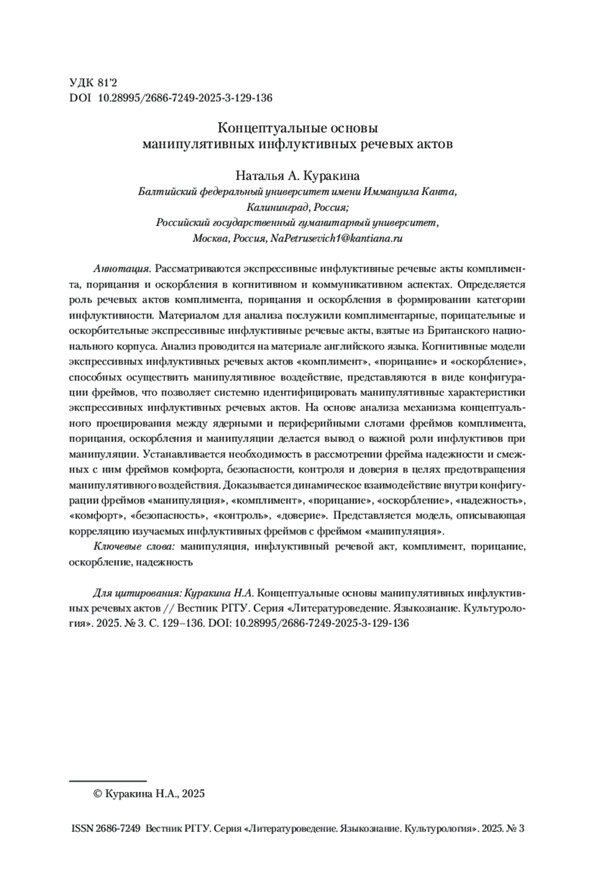 КУРАКИНА Н. А. КОНЦЕПТУАЛЬНЫЕ ОСНОВЫ МАНИПУЛЯТИВНЫХ ИНФЛУКТИВНЫХ РЕЧЕВЫХ АКТОВ // ВЕСТНИК РГГУ. СЕРИЯ «ЛИТЕРАТУРОВЕДЕНИЕ. ЯЗЫКОЗНАНИЕ. КУЛЬТУРОЛОГИЯ». 2025. № 3
