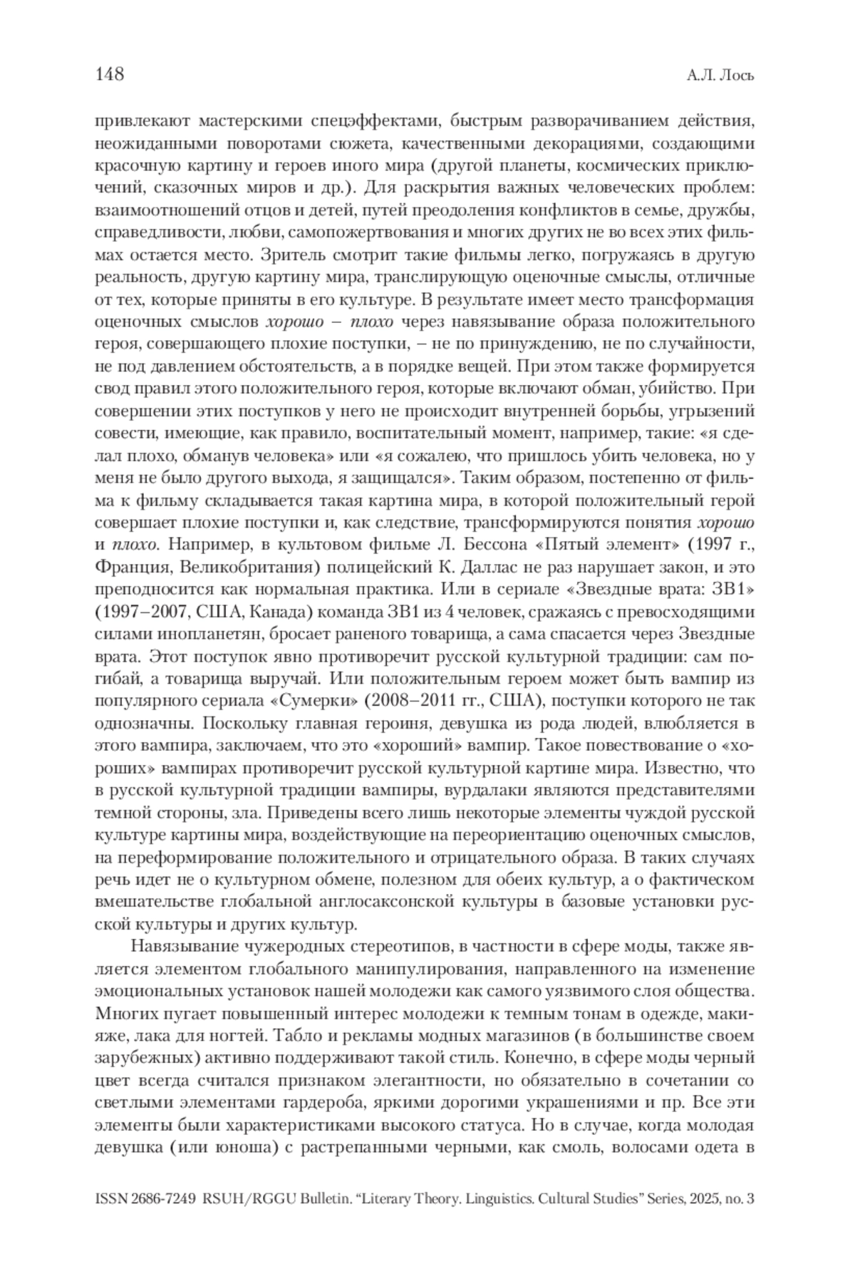 Статья посвящена изучению манипуляционного воздействия на механизм восприятия оценочных смыслов, репрезентированных перцептивными характеристиками светлый – темный, белый – черный. Обозначены подходы к определению манипулирования как способа социального, психологического, речевого воздействия на индивида. Рассмотрены элементы манипуляционного воздействия современной зарубежной, в основном американской, культуры (киноиндустрии, моды, традиций) на сознание представителей русской культуры, которые могут привести к переформатированию исконно русских ценностей. Выявлено, что воздействие с целью подмены истинных духовных ценностных составляющих на идеалы, которые не коррелируют с идеалами русской культуры, приводит к изменению восприятия ценностей, репрезентированных в русской культуре перцептивными характеристиками светлый – темный, белый – черный. В результате происходят более глубинные изменения в восприятии носителями русской культуры духовных, конвенциональных сакральных смыслов. Нарушается механизм передачи оценочных смыслов: свет, светлый, чистота, чистый – «возвышенный, благородный, честный», а тьма, темнота, чернота, чернушный как противовес свету, чистоте – «низкий, подлый, низменный». Вследствие переформатирования оценочных образов хороший – плохой происходит подмена истинных духовных ценностных составляющих добро и зло, светлый и темный, которые определяют культурный код русского народа, и искажается когнитивный механизм, отвечающий за передачу глубинных культурных смыслов, репрезентированных перцептивными характеристиками.