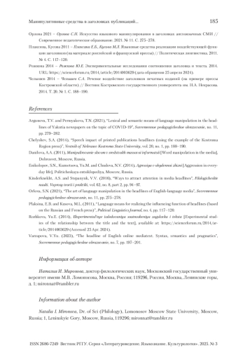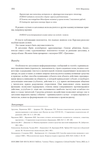 МИРОНОВА Н. И. МАНИПУЛЯТИВНЫЕ СРЕДСТВА В ЗАГОЛОВКАХ ПУБЛИКАЦИЙ О КРИМИНАЛЬНЫХ ПРОИСШЕСТВИЯХ // ВЕСТНИК РГГУ. СЕРИЯ «ЛИТЕРАТУРОВЕДЕНИЕ. ЯЗЫКОЗНАНИЕ. КУЛЬТУРОЛОГИЯ». 2025. № 3