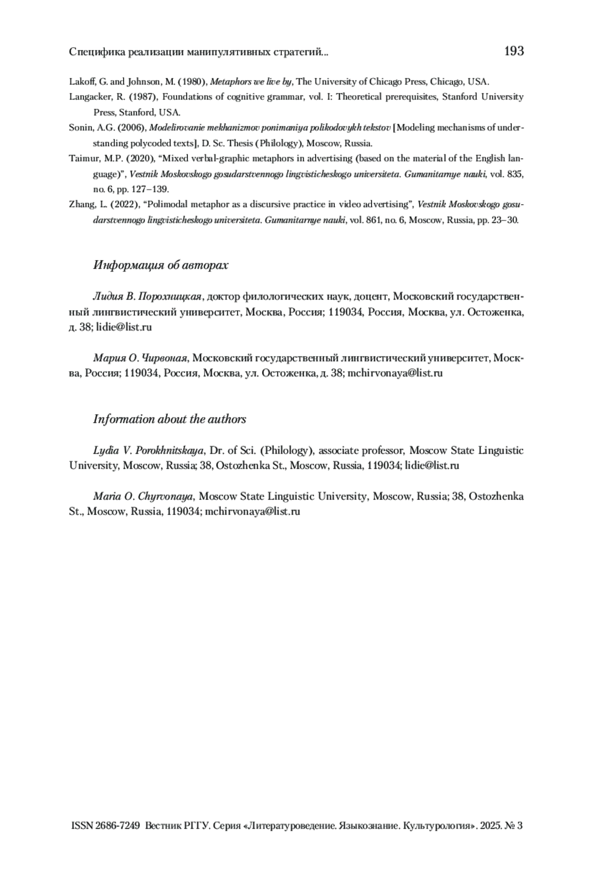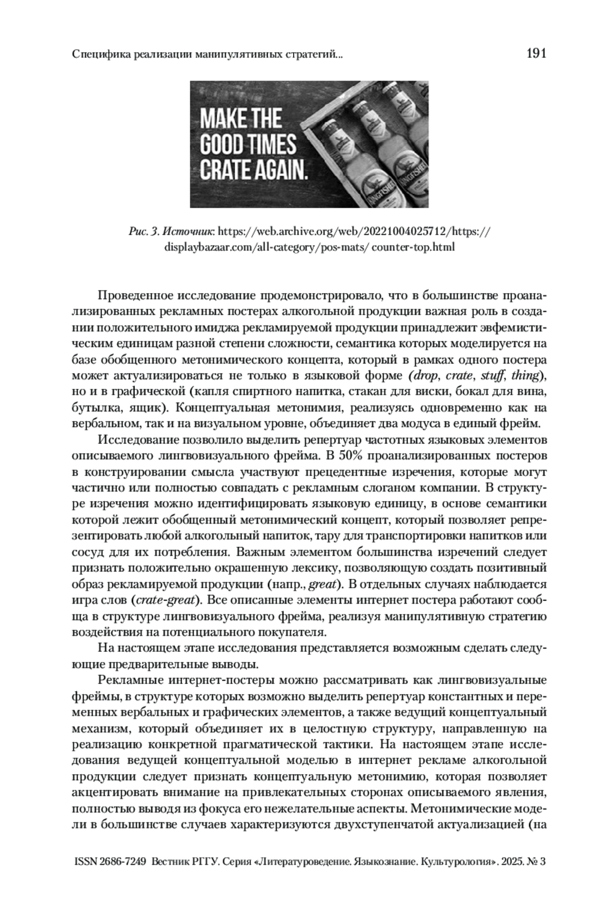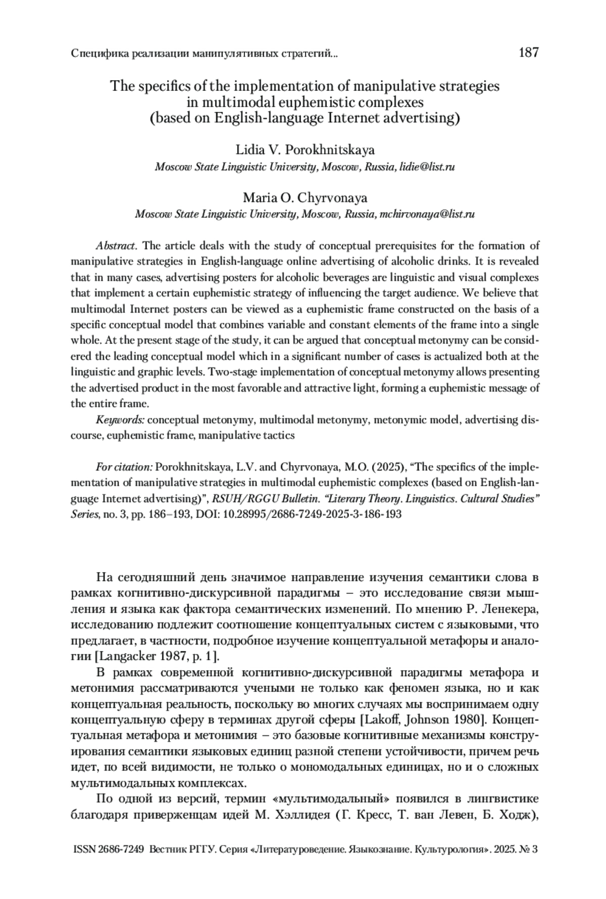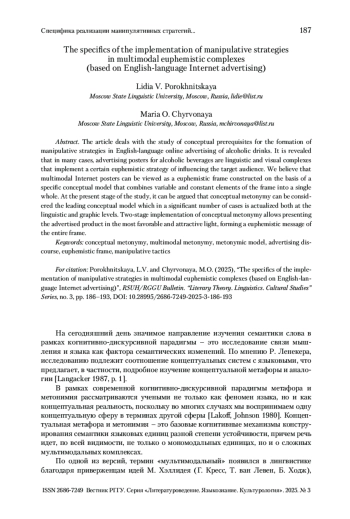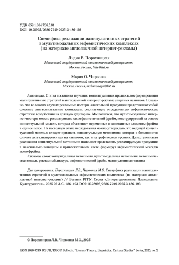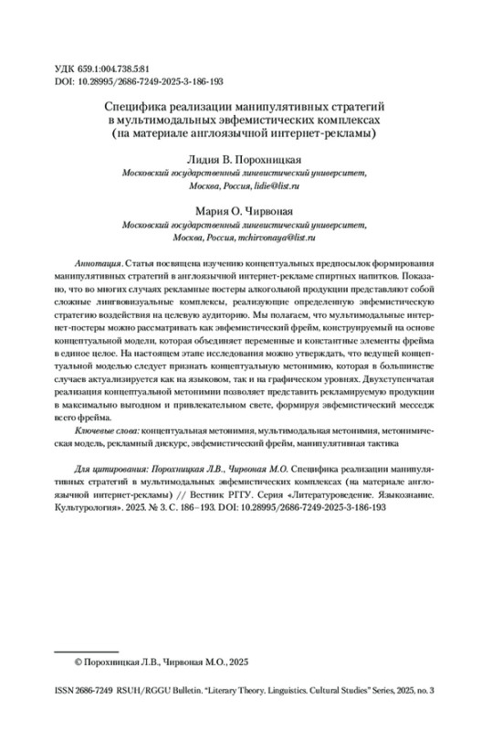 ПОРОХНИЦКАЯ Л. В., ЧИРВОНАЯ М. О. СПЕЦИФИКА РЕАЛИЗАЦИИ МАНИПУЛЯТИВНЫХ СТРАТЕГИЙ В МУЛЬТИМОДАЛЬНЫХ ЭВФЕМИСТИЧЕСКИХ КОМПЛЕКСАХ (НА МАТЕРИАЛЕ АНГЛОЯЗЫЧНОЙ ИНТЕРНЕТ-РЕКЛАМЫ) // ВЕСТНИК РГГУ. СЕРИЯ «ЛИТЕРАТУРОВЕДЕНИЕ. ЯЗЫКОЗНАНИЕ. КУЛЬТУРОЛОГИЯ». 2025. № 3