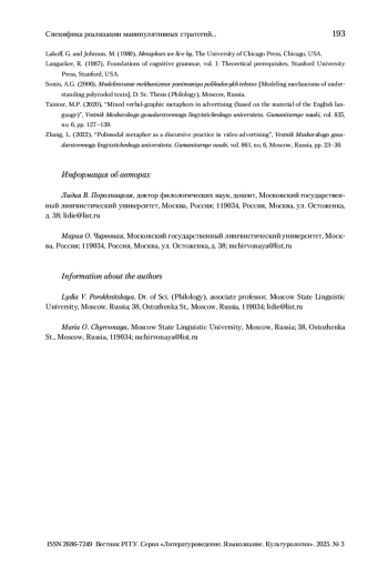 Статья: Специфика реализации манипулятивных стратегий в мультимодальных эвфемистических комплексах (на материале англоязычной интернет-рекламы) (2025)