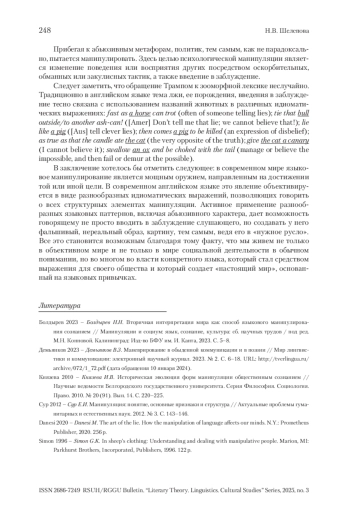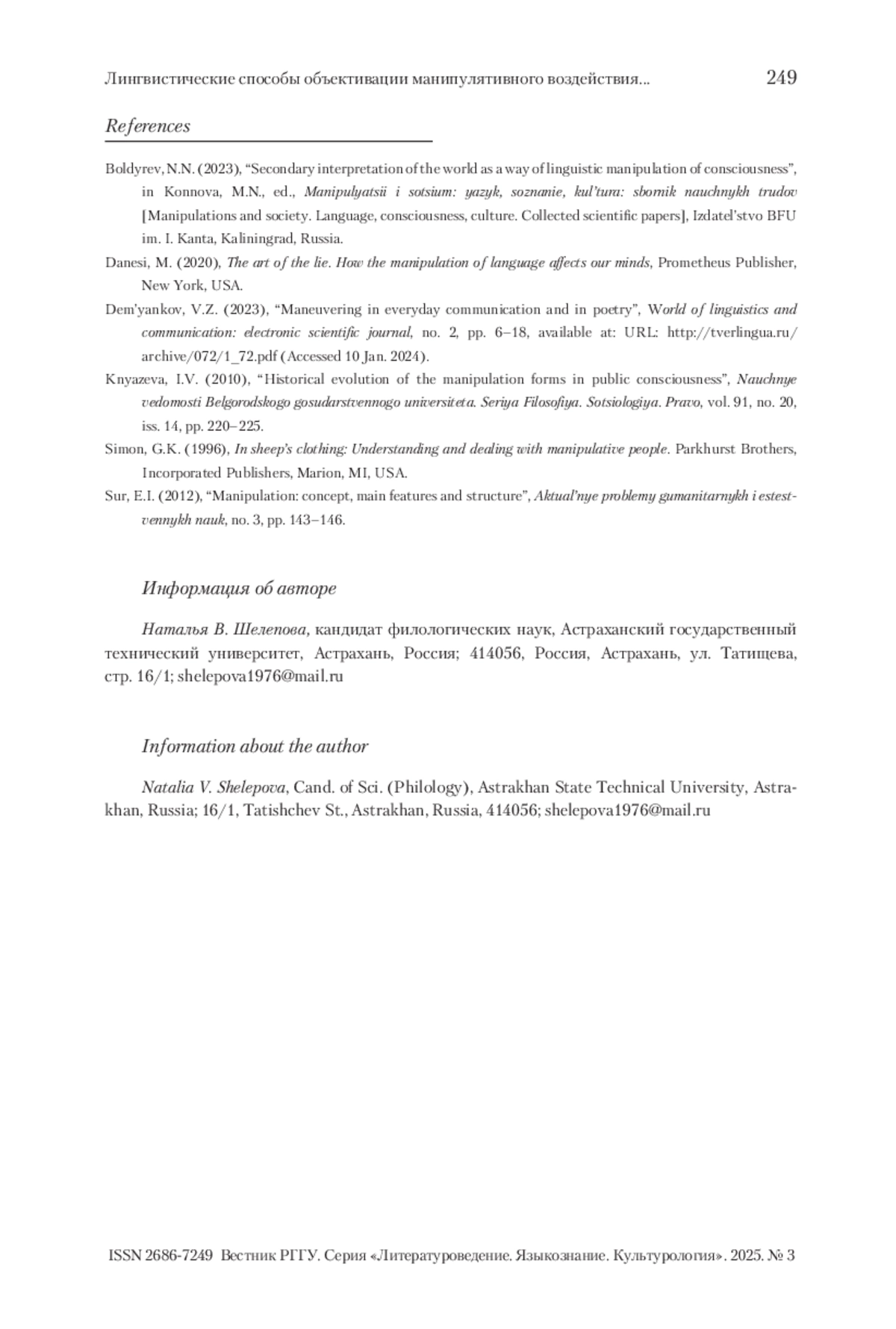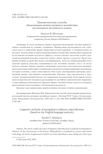 ШЕЛЕПОВА Н. В. ЛИНГВИСТИЧЕСКИЕ СПОСОБЫ ОБЪЕКТИВАЦИИ МАНИПУЛЯТИВНОГО ВОЗДЕЙСТВИЯ (НА МАТЕРИАЛЕ АНГЛИЙСКОГО ЯЗЫКА) // ВЕСТНИК РГГУ. СЕРИЯ «ЛИТЕРАТУРОВЕДЕНИЕ. ЯЗЫКОЗНАНИЕ. КУЛЬТУРОЛОГИЯ». 2025. № 3