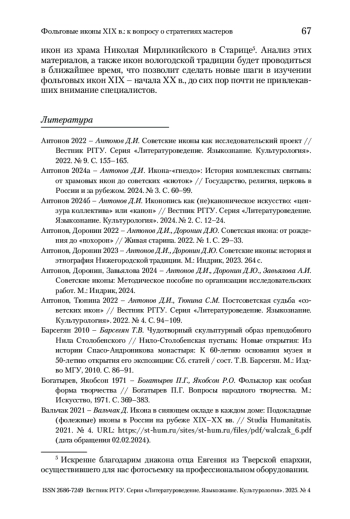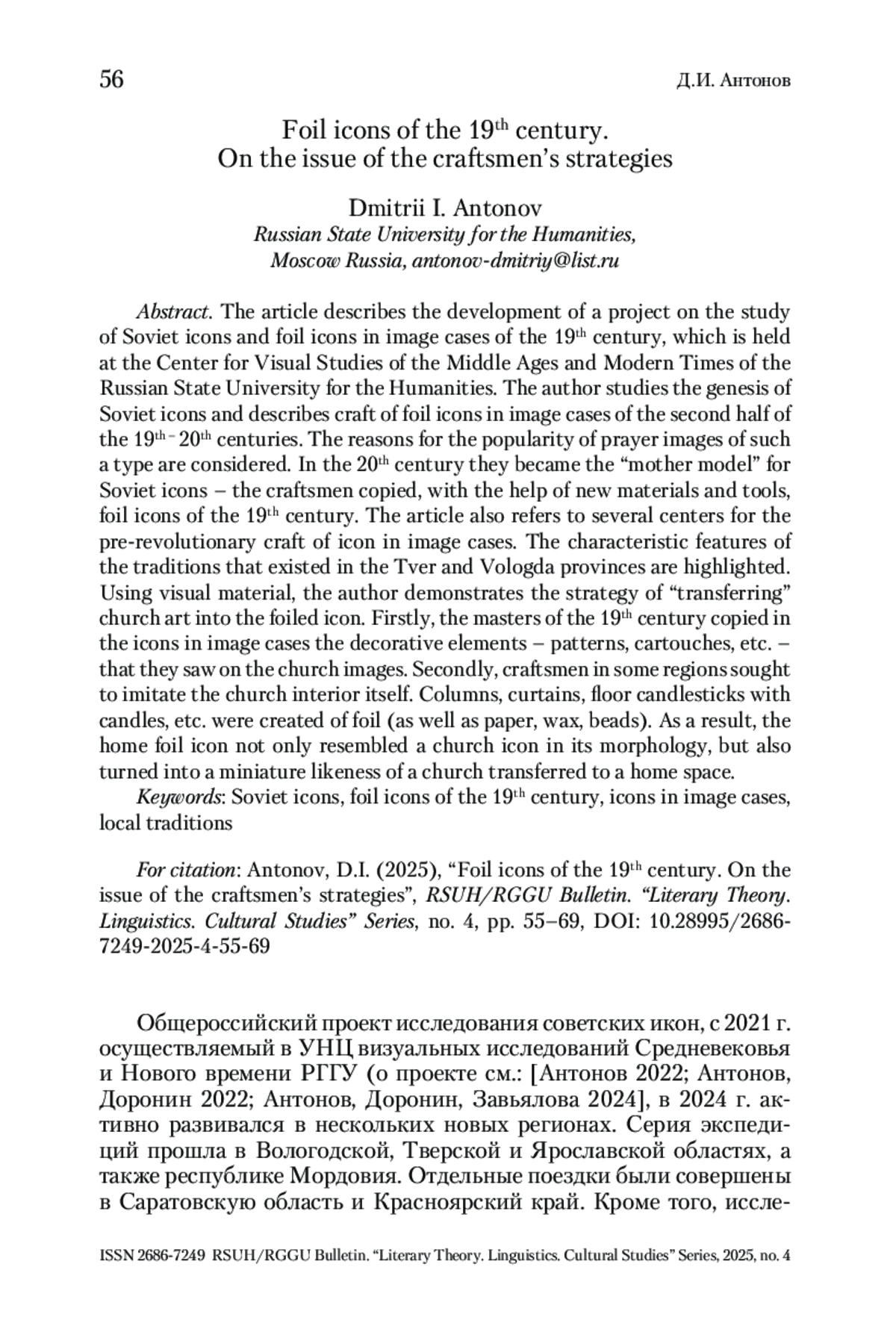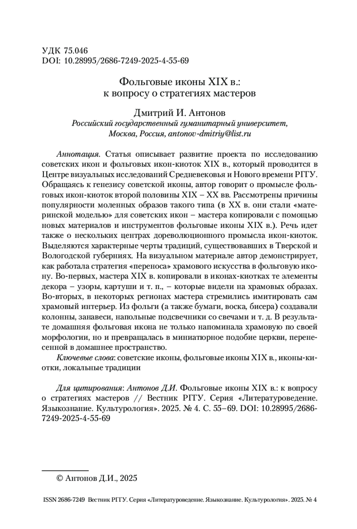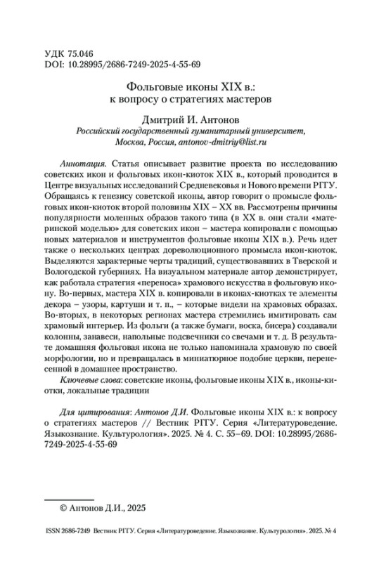 АНТОНОВ Д. И. ФОЛЬГОВЫЕ ИКОНЫ XIX В.: К ВОПРОСУ О СТРАТЕГИЯХ МАСТЕРОВ // ВЕСТНИК РГГУ. СЕРИЯ «ЛИТЕРАТУРОВЕДЕНИЕ. ЯЗЫКОЗНАНИЕ. КУЛЬТУРОЛОГИЯ». 2025. № 4