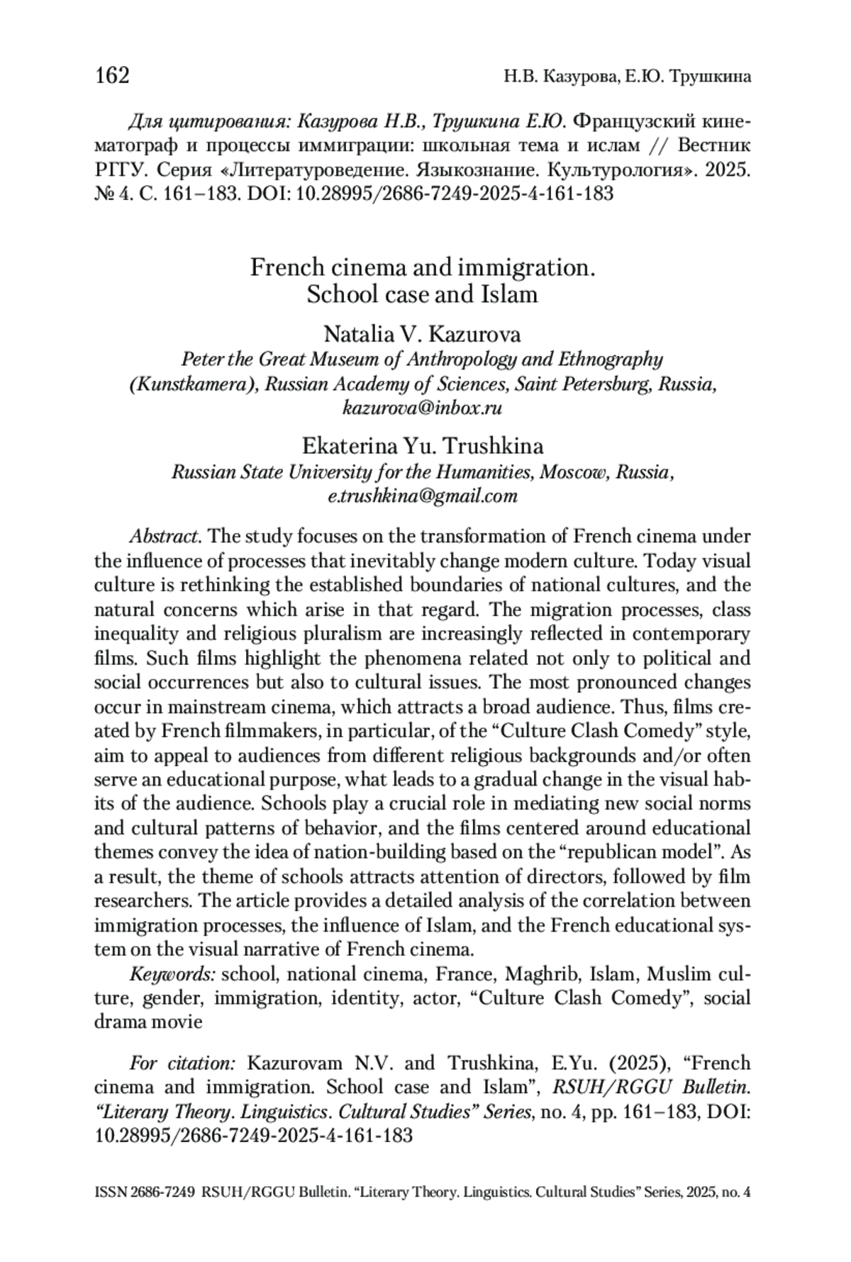 В фокусе исследования – трансформация французского кинематографа под влиянием процессов, неизбежно изменяющих современную культурную среду. Сегодня визуальная культура переосмысляет установленные границы национальных культур и возникающие в этой связи закономерные проблемы современного западного общества. Процессы миграции, классовое расслоение и религиозный плюрализм все больше находят отражение в кинолентах, выдвигая на первый план явления не только политического, социального, но и культурного порядка. Наиболее ярко описываемые изменения проявляются в кинематографе мейнстрима, направленного на широкую аудиторию. Так, созданные французским кинорежиссерами фильмы в стиле “Culture Clash Comedy” призваны примирить зрителей разных религиозных традиций и/или исполнить воспитательную функцию, что приводит к постепенной смене визуальных привычек кинозрителей. Одним из медиаторов новых социальных норм поведения и культурных паттернов поведения выступает школа, а сами фильмы о школе переносят на киноэкраны идею формирования нации по «республиканской модели». Таким образом, школьная тема привлекает внимание режиссеров, а вслед за ними и исследователей кинематографа. В статье представлен последовательный анализ корреляции между процессами иммиграции, влиянием ислама и школьной французской системой на визуальный нарратив французского кинематографа.