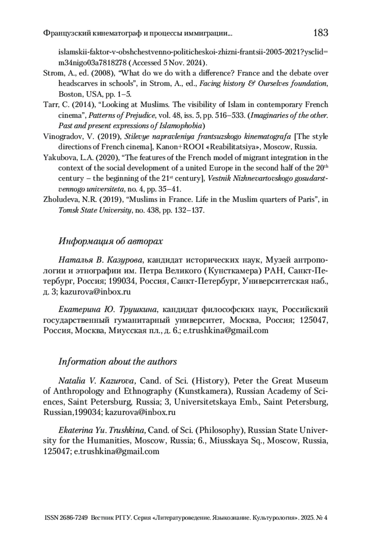 39. Tarr 2014 - Tarr С. Looking at Muslims. The visibility of Islam in contemporary French cinema // Patterns of prejudice. 2014. Vol. 48. Iss. 5. P. 516-533. (Imaginaries of the other. Past and present expressions of Islamophobia)