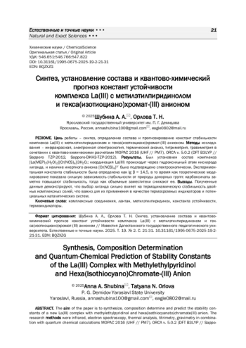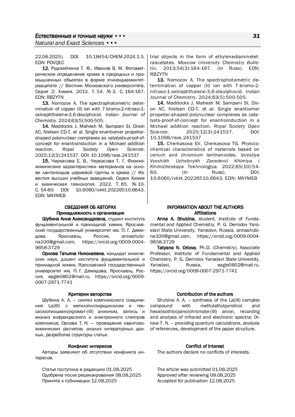 11. Шубина А. А., Орлова Т. Н. Синтез и особенности структуры комплексных соединений La(III) с органическими лигандами // Cifra. Химия. 2024. № 1(1). URL: https://chemistry.cifra.science/archive/1-1-2024-april/10.18454/CHEM.2024.1.5 (дата обращения: 22.08.2025). DOI: 10.18454/CHEM.2024.1.5.