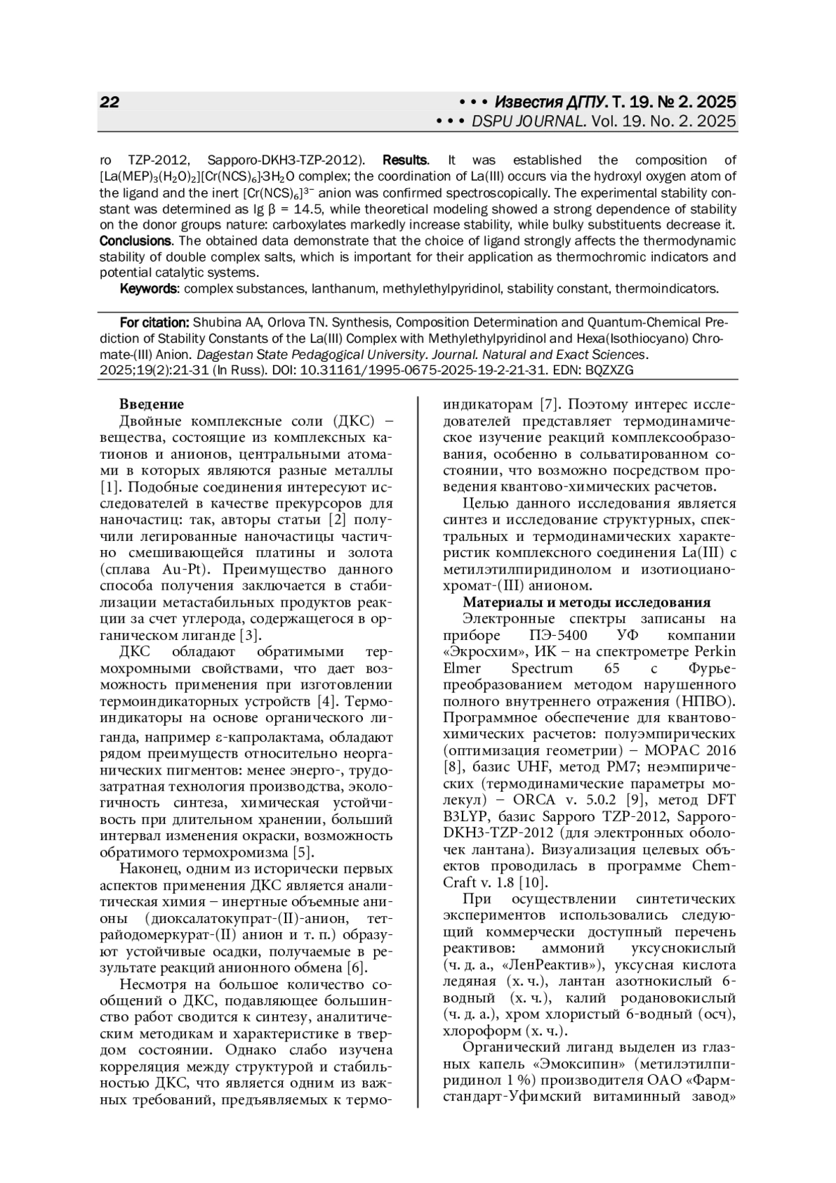 Цель работы - синтез, определение состава и прогнозирование констант стабильности комплекса La(III) с метилэтилпиридинолом и гекса(изотиоциано)хромат-(III) анионом. Методы исследования - инфракрасная, электронная спектроскопия, термический анализ, титриметрия, гравиметрия в сочетании с квантово-химическими расчетами MOPAC 2016 (UHF // PM7), ORCA v. 5.0.2 (DFT B3LYP // Sapporo TZP-2012, Sapporo-DKH3-TZP-2012). Результаты. Был установлен состав комплекса [La(MEP)₃(H₂O)₂][Cr(NCS)₆]·3H₂O.; координация La(III) происходит через гидроксильный атом кислорода лиганда, и наличие инертного аниона [Cr(NCS)₆]3⁻ было подтверждено спектроскопически. Экспериментальная константа стабильности была определена как lg β = 14,5, в то время как теоретическое моделирование показало сильную зависимость стабильности от природы донорных групп: карбоксилаты заметно повышают стабильность, тогда как объемные заместители снижают ее. Выводы. Полученные данные демонстрируют, что выбор лиганда сильно влияет на термодинамическую стабильность двойных комплексных солей, что важно для их применения в качестве термохромных индикаторов и потенциальных каталитических систем.